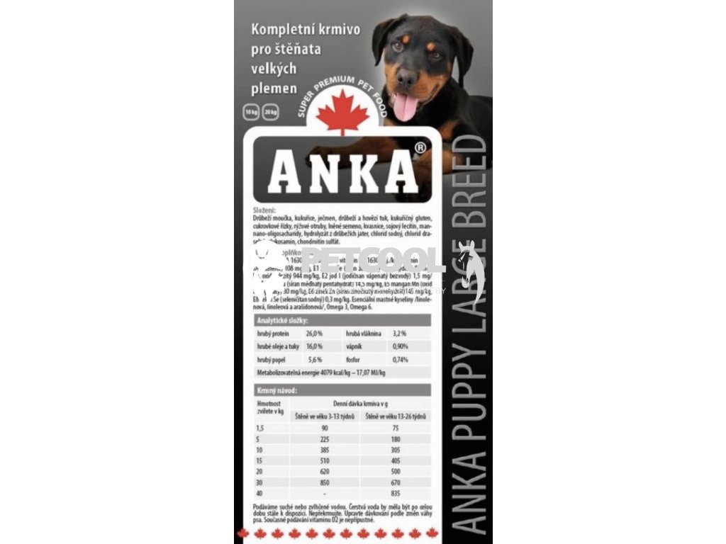 Granule ANKA PUPPY LARGE BREED DOG je kompletní krmivo s nejkvalitnějším drůbežím masem pro štěňata do 18-ti měsíců velkých plemen. Granule pro zdravý růst a pevný základ do života. Obsahuje optimální poměr bílkovin, tuků a vápníku s fosforem pro správný vývoj svalů, kostí i zubů.