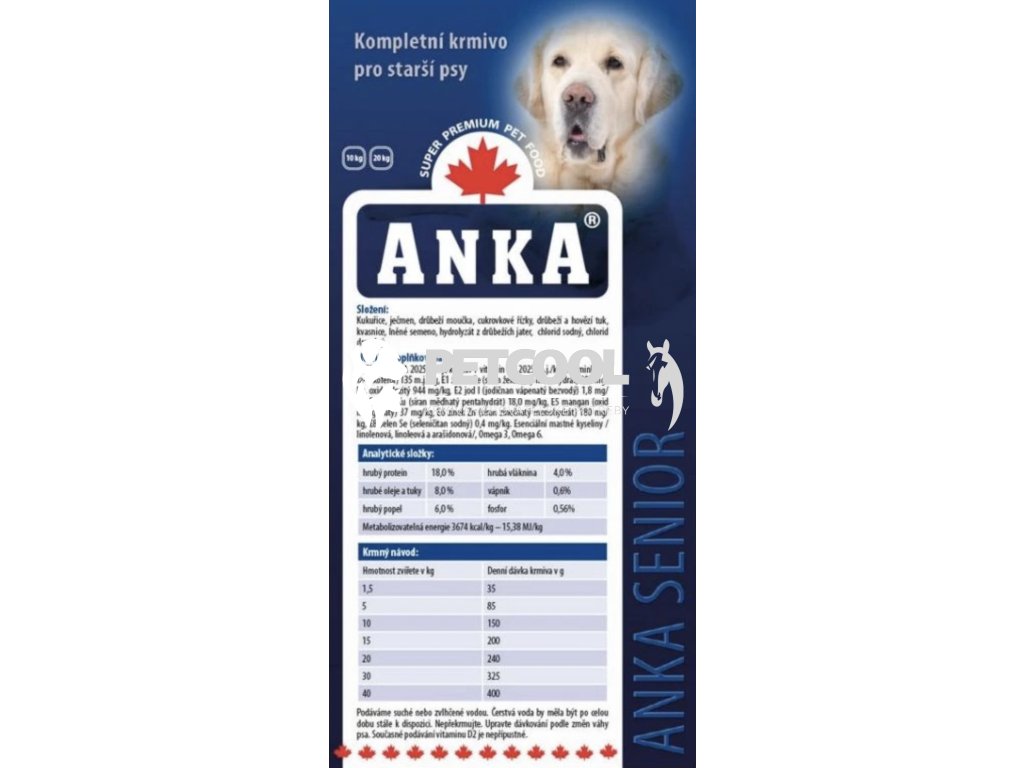 Granule ANKA SENIOR DOG je kompletní krmivo s nejkvalitnějším drůbežím masem pro starší psy všech plemen, nebo pro psy se sklonem k obezitě. Granule pro podporu zdraví a vitality v pokročilejším věku psa. Tato speciální výživa dodává redukovaný protein pro zajištění správné funkce ledvin a má sníženou kalorickou hodnotu potřebnou k prevenci obezity. Zároveň však zajišťuje dostatečný příjem vitamínů a minerálů, které jsou důležité pro imunitu, kondici a kvalitu života v seniorském věku.