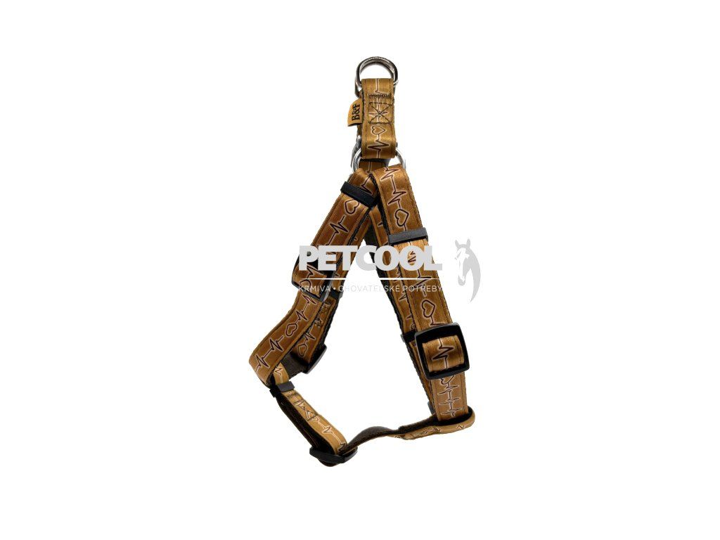 Nylonový postroj pro psy z měkkého a příjemného popruhu v hnědé barvě s motivem EKG. Postroj má pevnostní kovová oka a umělou rychlosponu. Postroj je pevně prošitý a štelovatelný v oblasti krku, hrudníku a prsou.