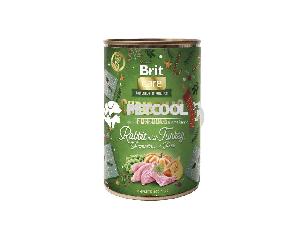 Brit CHRISTMAS Rabbit with Turkey, Pumpkin and Peas pro všechny dospělé psy, kompletní krmivo s vyváženou výživou v limitované vánoční edici s recepturou "Česká vánoční večeře" s králičím a krůtím masem, dýní a hráškem. Vhodné pro psy citlivé na krmivo, jelikož v konzervě je pouze protein z králičího a krůtího masa. Receptura s obsahem prémiové kombinace dvou proteinů, je vhodná ke snížení rizika alergií a potravinové intolerance. Umožní psovi užít si štědrovečerní večeři a navíc nutričně vyváženým způsobem.