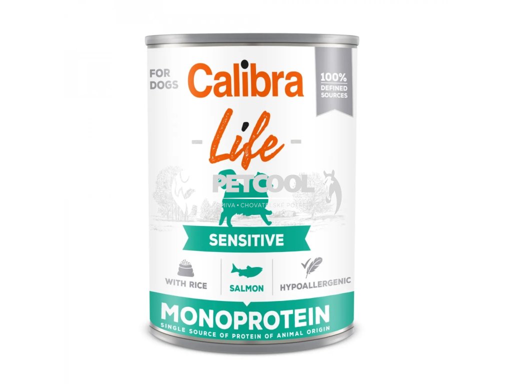 CALIBRA DOG LIFE KONZERVA SENSITIVE SALMON je kompletní monoproteinové bezlepkové krmivo pro dospělé psy zejména s citlivým zažíváním, s lososem. Vhodná nejen pro psy s citlivým zažíváním. Krmivo je sestaveno z limitovaného počtu ingrediencí. Bezlepkové složení s nízkým obsahem rýže, bezobilné, nezatěžují organismus a je lehce stravitelné. Přispívá ke správnému růstu a vývoji, podporuje celkové fungování organismu psa v každém věku a napomáhá k posílení imunity. Výhodou vlhkého krmiva je přirozený obsah tekutin, který pomůže zajistit hydrataci.