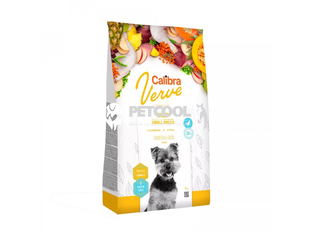 CALIBRA DOG VERVE GRAIN FREE JUNIOR SMALL CHICKEN&DUCK jsou granule s čerstvým masem pro mladé psy od 3-12 měsíců mini a malých plemen do 10 kg. Krmivo obsahuje 30 % čerstvého kuřecího masa a vysoký obsah kvalitních proteinů z kachny, a díky vysokému obsahu čerstvého kuřecího masa 30 % a kvalitnímu kachnímu proteinu se psovi dostane přirozená strava tolik potřebná pro jeho správný růst a vývoj. Receptura odpovídá nejvyšším požadavkům na přirozené stravování psa v souladu s jeho fyziologickými potřebami a je zárukou jeho kvalitní výživy. Čerstvé maso je vysoce výživným zdrojem bílkovin, který se vyznačuje nejen atraktivní chutí, ale je vhodné i pro citlivé zažívání. Grain free receptura je skvěle stravitelná, obsahuje kvalitní zdroje proteinu, které jsou z 70 % živočišného původu, a také adekvátní množství sacharidů a vlákniny. Je energeticky pečlivě vyvážená. Navíc obsahuje jedinečný mix vybraných funkčních aditiv Triple active formula, který zajistí ten správný efekt této receptury.