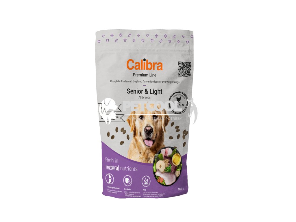Granule CALIBRA Premium Line SENIOR&LIGHT CHICKEN je lehce stravitelné a kompletní krmivo speciálně přizpůsobené potřebám starších psů a psů s nadváhou a jejich citlivému trávícímu systému. Napomáhá zpomalovat proces stárnutí a preventivně působí proti onemocnění kloubů. Správný poměr chondroprotektiv, vitamínů a chelátových minerálů podporuje pohybový aparát a napomáhá v boji s nadváhou. Nově je přidáno funkční aditivum kelpa jako přírodní zdroj minerálů a bioaktivních látek, antioxidantů na podporu zdravého chrupu.