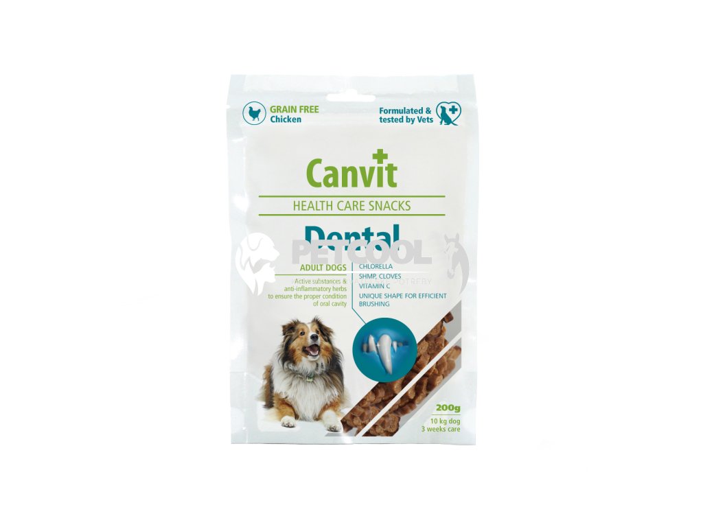Canvit Dental Large Breed Health Care Snacks je poloměkký funkční pamlsek pro psy, s kuřecím masem, s neodolatelnou chutí. Tento pamlsek je pro každodenní péči o zuby a dásně, s protizánětlivým účinkem. Zubní kámen, plak a zánět dásní je u psů velmi častý problém, který se u psů projevuje nepříjemným zápachem z úst, krvácením z dásní, bolestivostí, neochotou kousat a často končí vytržením zubu. Jedinou účinnou péčí o zuby je prevence zaměřená na snížení tvorby zubního plaku. Chlorella, Hřebíček, omega 3 nenasycené mastné kyseliny, kolagen a hexametafosfát účinně potlačují vznik zubního plaku a dále mají protizánětlivý, antiseptický a hojivý účinek na sliznici dásní.