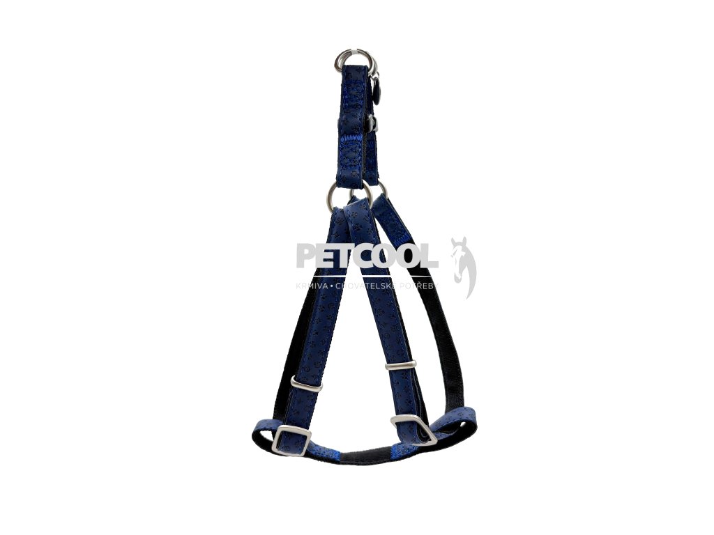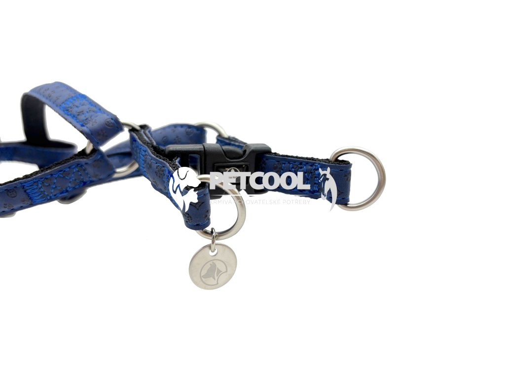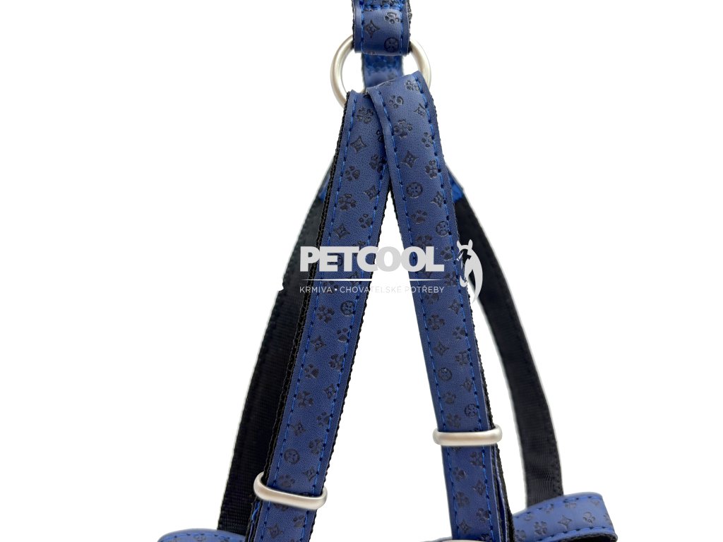 Stylový a pohodlný postroj v imitaci kůže v modré barvě. Postroj je vyroben z dvojité vrstvy s celopotiskem vzoru tlapky a čtyřlístku a čtverečků připomínající Louis Vuitton. Spodní vrstva je z měkkého lesklého červeného popruhu. Vnější vrstva je z materiálu imitace kůže v celopotisku červené barvy.
