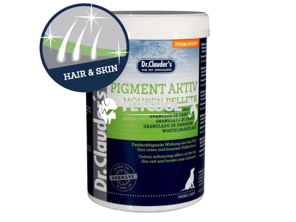 Pigment pro psy s načervenalou nebo hnědou srstí Dr. Clauder's Pigment Aktiv Möhren Pellets - tento speciální přípravek podporuje přirozenou pigmentaci a obnovuje sílu barvy. Ideální pro psy s načervenalou srstí, která ztratila intenzitu barvy. Provitamín A (beta-karoten) obsažený v mrkvi podporuje načervenalou a hnědou pigmentaci srsti, pokud je stále přítomna (alespoň ve zbytcích). Mrkvový granulát se doporučuje podávat v kombinaci s nějakým olejem pro zlepšení vstřebávání provitamínu A rozpustného v tucích.