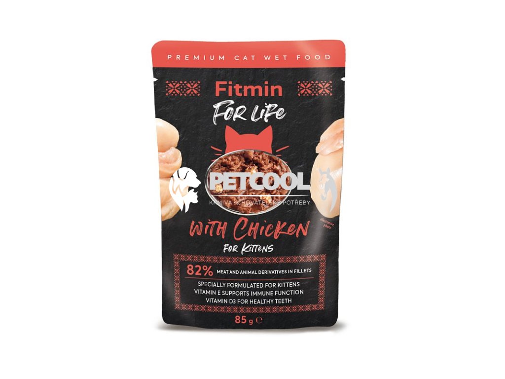 Fitmin For Life Kittens Chicken - kapsička pro koťata s kuřecím masem, která obsahuje až 82 % masa a taurin, který je pro kočky prospěšný.