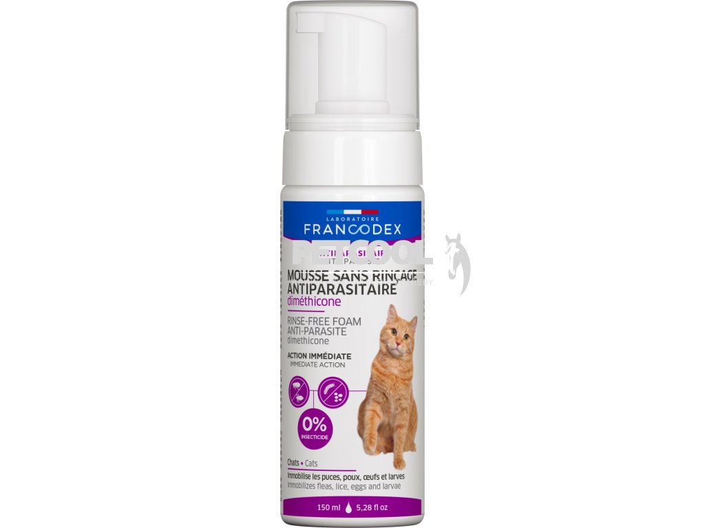 Bezoplachová pěna pro kočky proti vnějším parazitům jako jsou blechy, vši, vajíčka a larvy. Veterinární přípravek s obsahem dimetikonu se chová jako okamžitá mechanická past, která vnější parazity obalí. Znehybnění paraziti ze zvířete opadají, nebo je odstraníte mechanicky při vyčesávání srsti. Pěnu lze použít i na březí a kojící zvířata jelikož neobsahuje ani pesticidy a insekticidy.