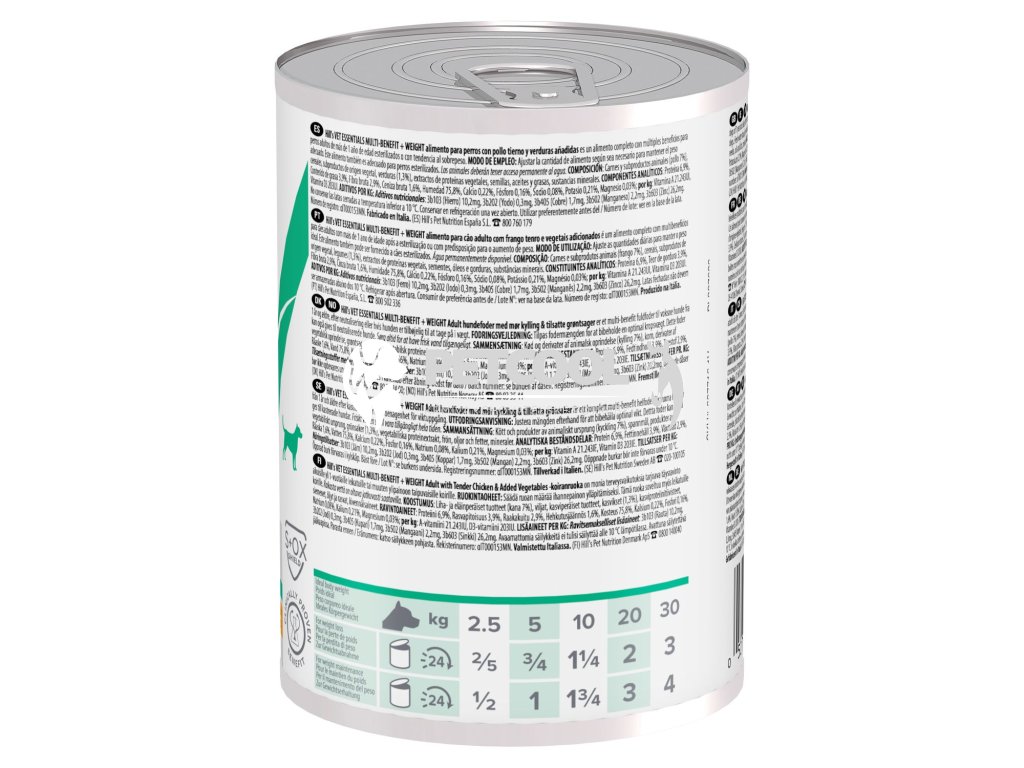 Hill's VET ESSENTIALS MULTI-BENEFIT +WEIGHT ADULT 1+ CHICKEN&VEGETABLES je kompletní krmivo s křehkým kuřetem a zeleninou pro dospělé psy, všestranně prospěšná výživa pro psy starší 1 roku po kastraci nebo při tendenci k přibírání na váze. Složení tohoto krmiva podporuje zdravou hmotnost a také zdravé trávení a zdravé klouby. Unikátní technologie pro regulaci hmotnosti podporuje spalování tuků a pomáhá tak psům k dosažení a udržení optimální hmotnosti — pro lepší dnešek a spoustu dalších zítřků.