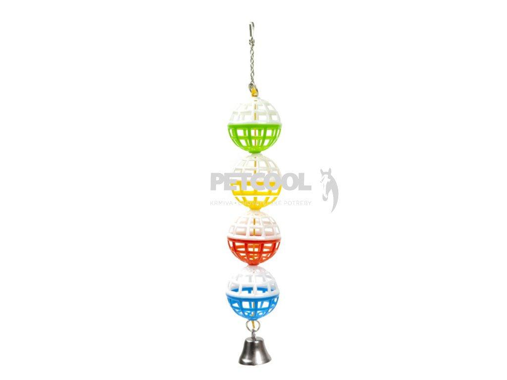 Plastové čtyři míčky se zvonkem pro papoušky do klece nebo voliéry. Hračka se připevní pomocí kovového řetízku s karabinou.