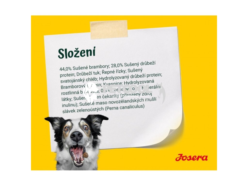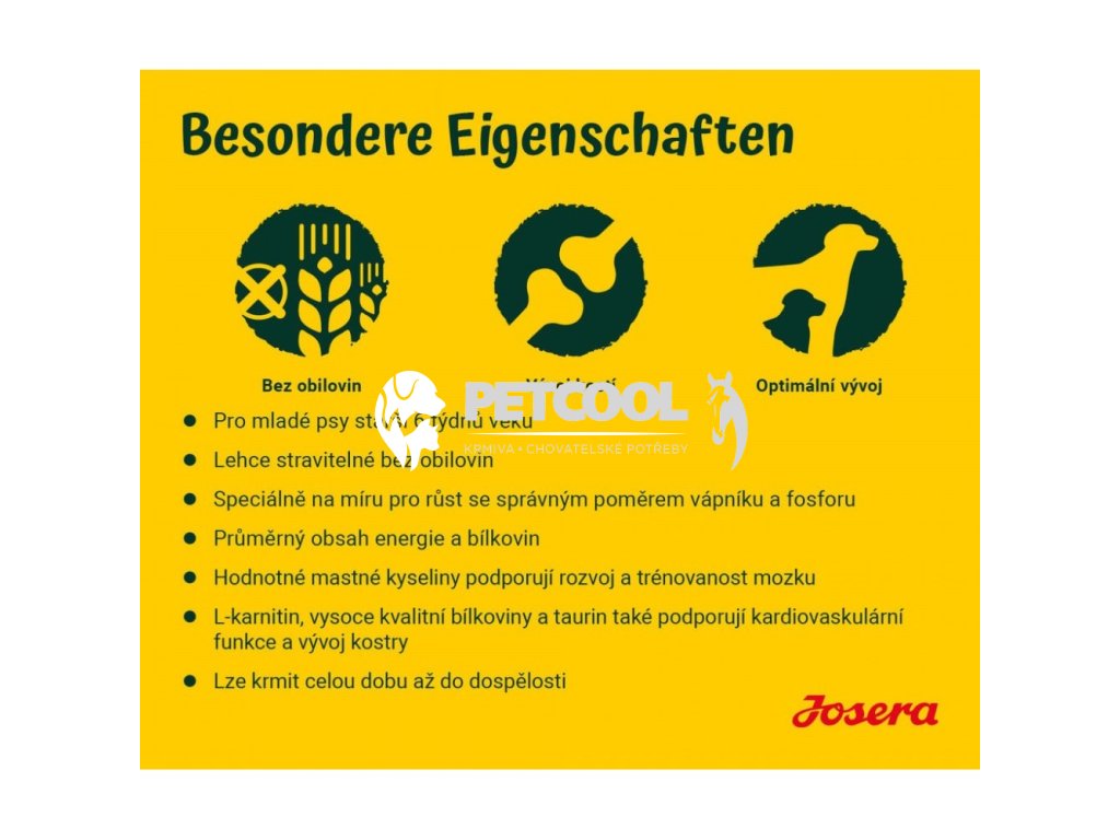 Granule JOSERA A/S JUNIOR YOUNGSTAR s drůbežím masem, doprovází psa od 8. týdne věku až do dospělosti a je složeno výhradně z kvalitních surovin. Krmivo bez obilovin disponuje optimálním poměrem vápníku a fosforu, což je v růstové fázi velmi důležité, dále obsahuje vitamín C, mangan a měď. Tato kombinace důležitých látek příznivě ovlivňuje vývoj kostí a zdraví kloubů. Zároveň dodává mladým psům v růstové fázi s běžnou aktivitou přiměřené množství energie bílkovin z kvalitního drůbežího masa a brambor. Krmivo je lehce stravitelné a vhodné i pro jedince s citlivým zažíváním.