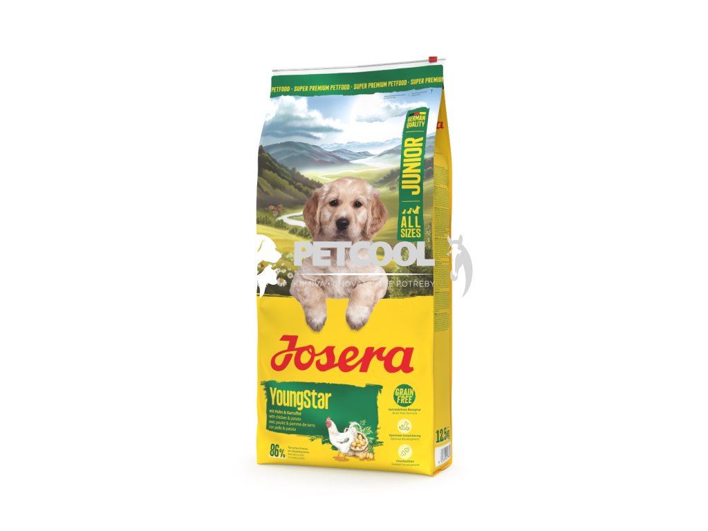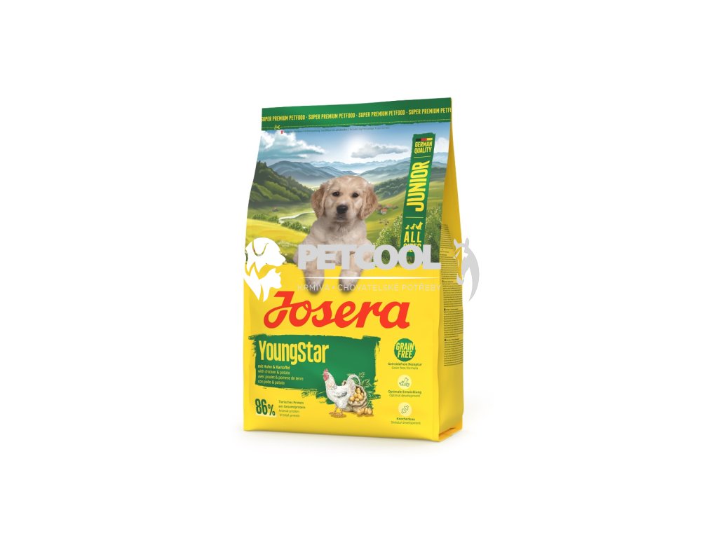 JOSERA JUNIOR YOUNGSTAR granule s drůbežím masem, doprovází psa od 6. týdne věku až do dospělosti a je složeno výhradně z kvalitních surovin. Krmivo bez obilovin disponuje optimálním poměrem vápníku a fosforu, což je v růstové fázi velmi důležité, dále obsahuje vitamín C, mangan a měď. Tato kombinace důležitých látek příznivě ovlivňuje vývoj kostí a zdraví kloubů. Zároveň dodává mladým psům v růstové fázi s běžnou aktivitou přiměřené množství energie bílkovin z kvalitního drůbežího masa a brambor. Krmivo je lehce stravitelné a vhodné i pro jedince s citlivým zažíváním.