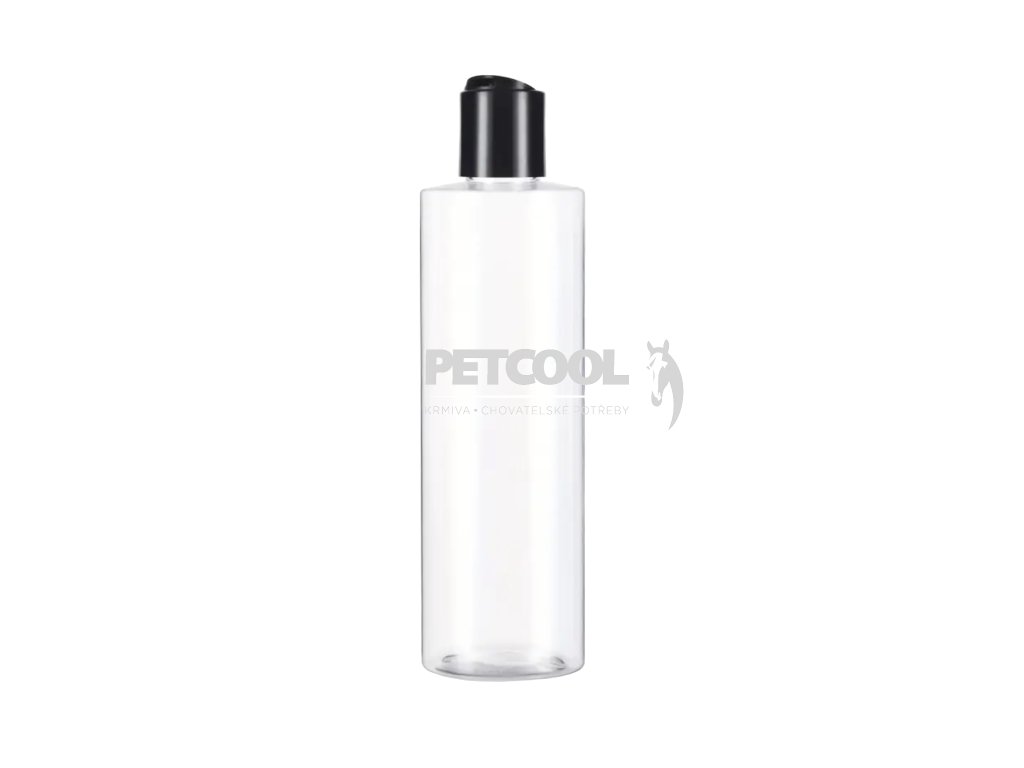 Transparentní láhev na namíchání šampónů z koncentrátů. Láhev má černé diskové víčko pro snadné ovládání jedné ruky.