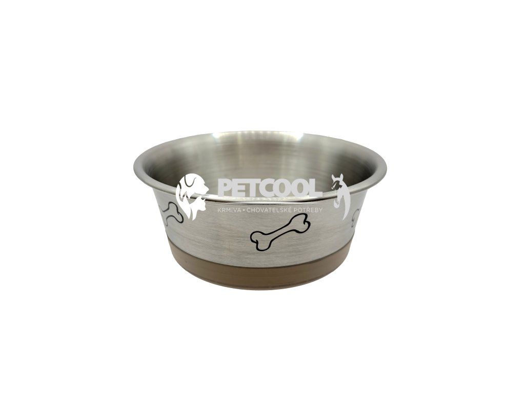 Miska pro psy z kartáčovaného nerezu a celoplošně pogumovaným hnědým dnem. Miska je velmi dobře fixační, ať už je to dlažba, plovoucí podlaha nebo betonový povrch.