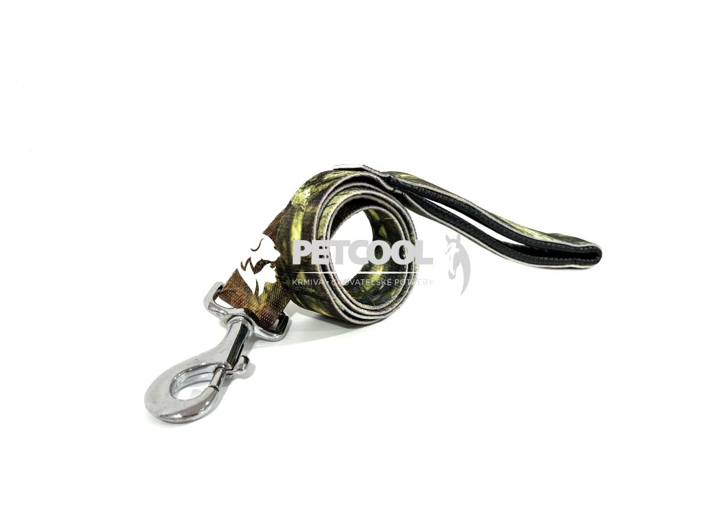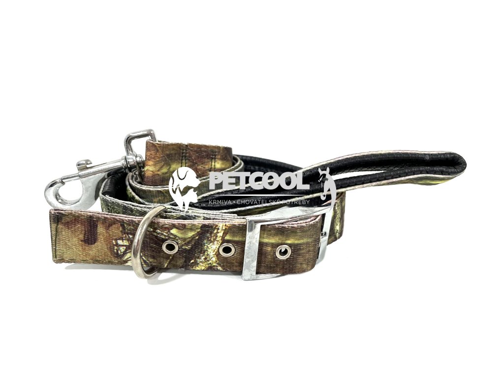 Nylonový obojek + vodítko pro psy, s kovovou sponou, v lovecké designu, s neoprenovým podšitím proti řezání do krku. Vodítko má opravdu masivní protáčivou sponu na velkého nebo silného psa. Obojek i vodítko má dva popruhy sešité k sobě.