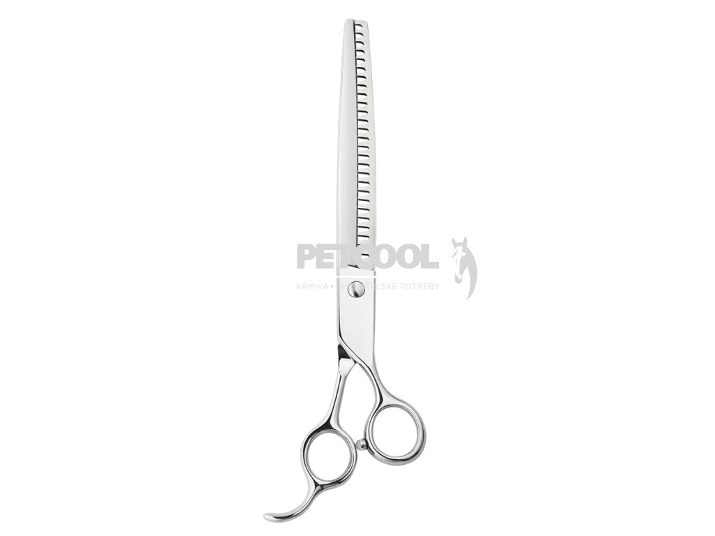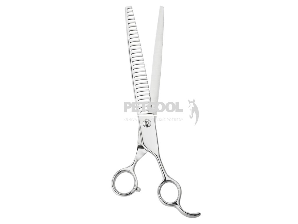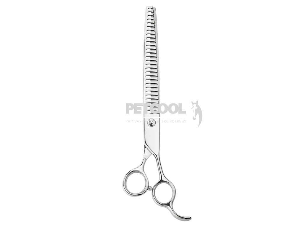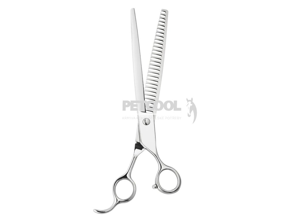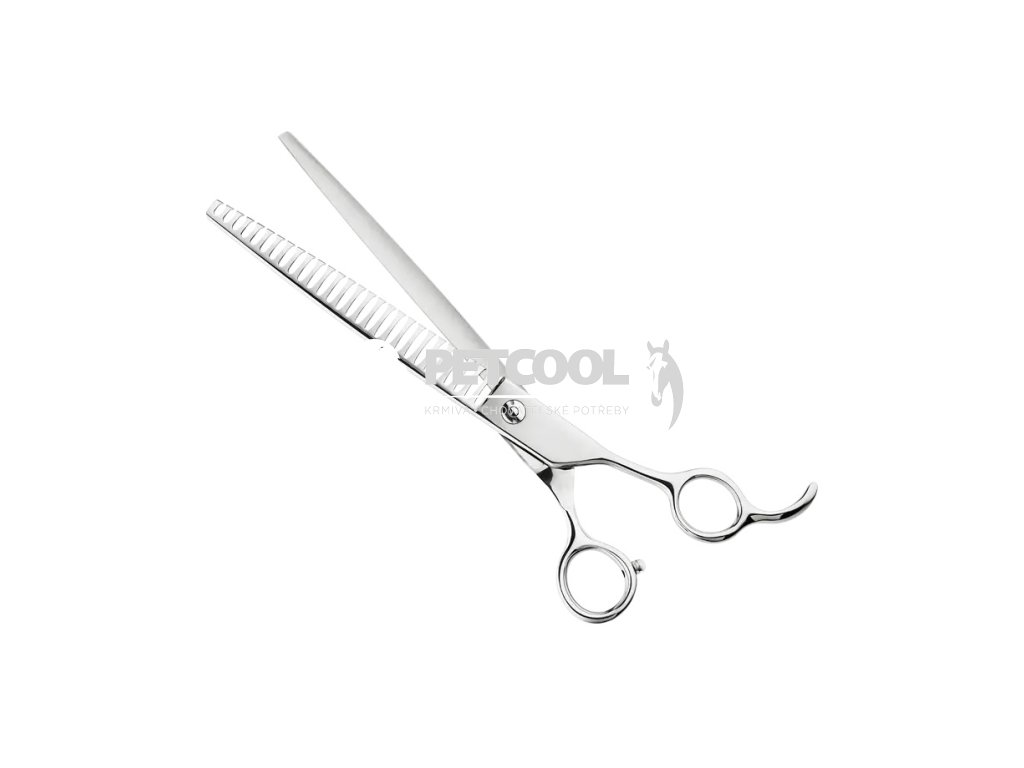 Profesionální oboustranné nůžky na stříhání domácích mazlíčků. Tyto nůžky jsou navrženy s ohledem na zvířecí srst a kůži, což zajišťuje bezpečné a pohodlné stříhání. Nůžky mají navíc v okách pro prsty gumové vyjímatelné vložky proti otlakům prstů.