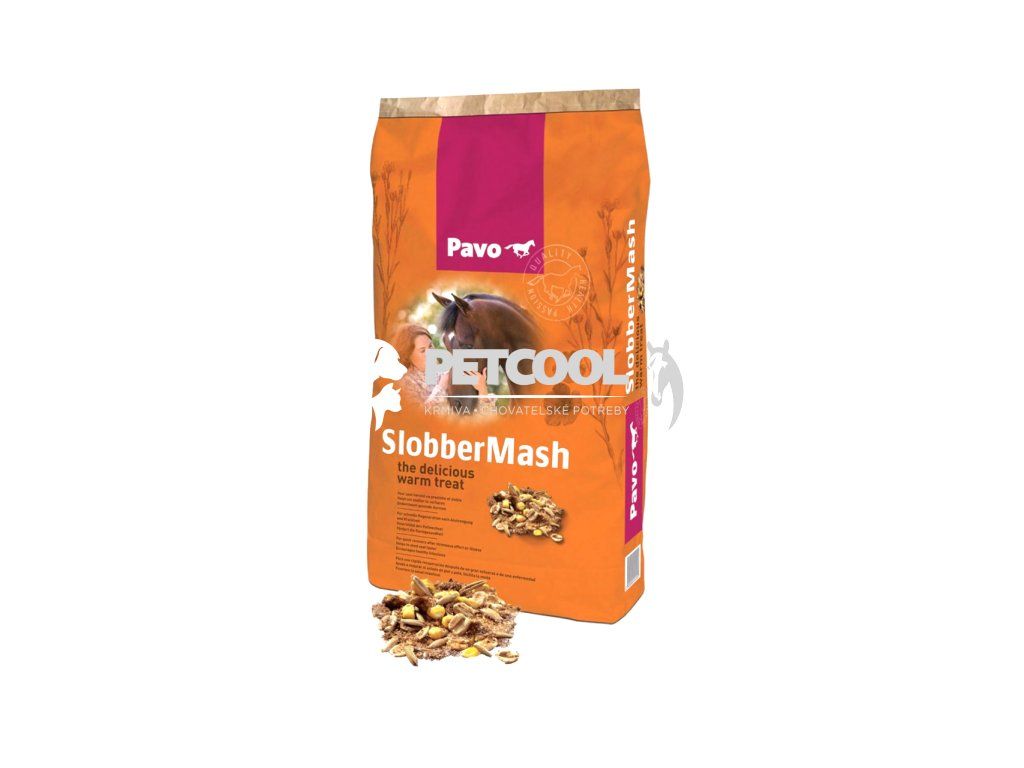 Pavo SlobberMash je kompletní krmivo pro koně vhodné zvláště jako velmi chutné zpestření běžného krmení. Díky vysoké kvalitě čistého lněného semene a dobře vybalancovaného množství vitamínů bude mít kůň nádhernou lesklou srst. Lehce stravitelné a extrémně vhodné pro koně, kteří mají problémy se zuby. Zajišťuje rychlé zotavení po namáhavé zátěži a zlepšuje fyzickou kondici po nemoci koní. Toto krmivo pro koně přirozeně podporuje dobré trávení, čímž snižuje možnost kolik.