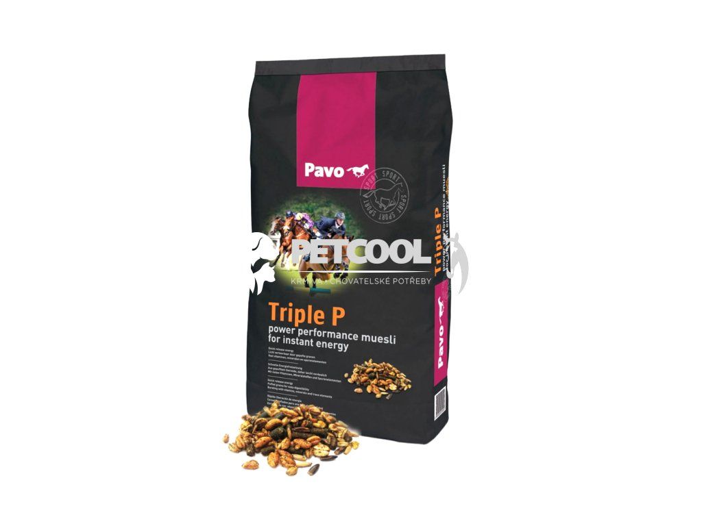 Pavo Triple P Power Performance - zátěžové müsli pro rychle dostupnou energii. Velmi chutné müsli s vyladěným obsahem vitaminů, minerálů a stopových prvků. Dodává rychlou energii a enormní sílu, hodí se tedy především pro koně, od kterých je očekáván explozivní výkon. Obsažené pufované obiloviny zaručují optimální vstřebání živin, které jsou tak tělu rychle a efektivně k dispozici. Díky vysoké chutnosti je toto krmivo také dobrým řešením pro koně, kteří mají během závodů problémy s příjmem potravy. Vhodné především pro parkurové, dostihové koně a pro klusáky.
