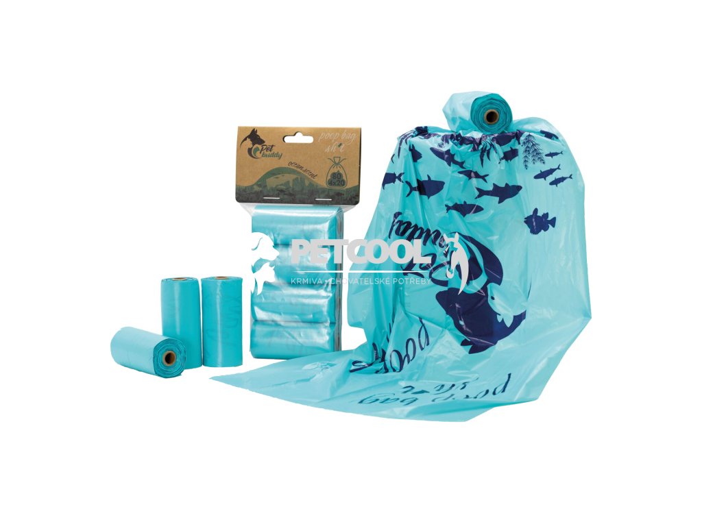 Modré sáčky na hovínka Pet Buddy s potiskem a vůní oceánu.