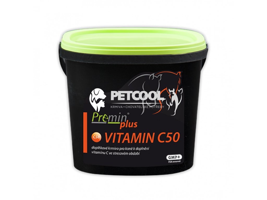 Premin® VITAMIN C50 je pro všechny kategorie koní ve stresovém období. Minerálně-vitamínové krmivo je určené pro všechny kategorie koní v zájmovém chovu. Slouží jako doplněk vitaminu C (50 % podíl vitamínu C) se účastňuje oxido-redukčních pochodů v těle. Podílí se na tvorbě steroidních hormonů, na srážení krve, zvyšuje odolnost organismu vůči infekcím a stresům. Je nazastupitelný při hojení ran, zlomenin a regeneraci nervů. Zdravý dospělý kůň si dokáže vitamín C syntetizovat v dostatečném množství v těle, ale je velmi vhodné podávat přídavek vitamínu C zvířatům nemocným, ve stresových situacích, ve zvýšené fyzické zátěži, v průběhu porodu, starým jedincům a nebo naopak hříbatům.