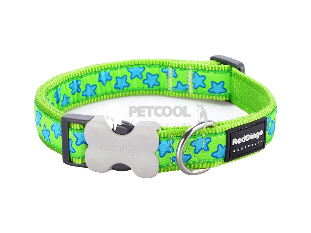 Obojek Red Dingo Star Limě Green je vyrobený z kvalitního nylonového popruhu. Okraje jsou hustě tkané pro ještě větší odolnost vůči oděru. Našitá stuha se vzorem hvězdiček je utkaná speciální technikou, která zaručuje vysokou odolnost a trvanlivost. Zakončení popruhu je pod úhlem 20 °, čímž je dosaženo maximálního komfortu pro psa. Použitá příze zajišťuje skutečnou stálost barev. Zapínání na originální plastovou šedou sponu Bucklebone ve tvaru kosti. Spona patří mezi nejpevnější na trhu a je vyrobená pouze z toho nejlepšího materiálu. Pro připnutí vodítka slouží svařovaný "D" kroužek.