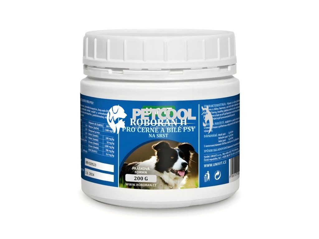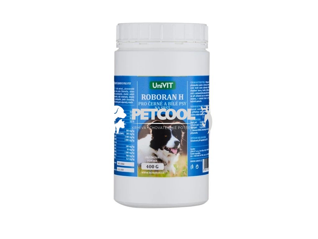 UniVIT ROBORAN® H je doplněk biologicky účinných látek. Vhodnou kombinací složení doplňku je dosaženo zlepšení kvality srsti. U černých a bílých psů zvyšuje kontrast barev bez vzniku žlutého nebo hnědého nádechu. Tablety jsou ochuceny tak, aby jej psi rádi přijímali. Je doporučen jako součást léčby nemocí kůže a srsti (ekzémy, záněty, vypadávání srsti) a při hojení ran. Používá se preventivně při potřebě zlepšit kvalitu srsti při přípravě psa na výstavu. Má výrazný vliv na zdraví kůži a následně na hustotu, lesk a výrazné zbarvení srsti.