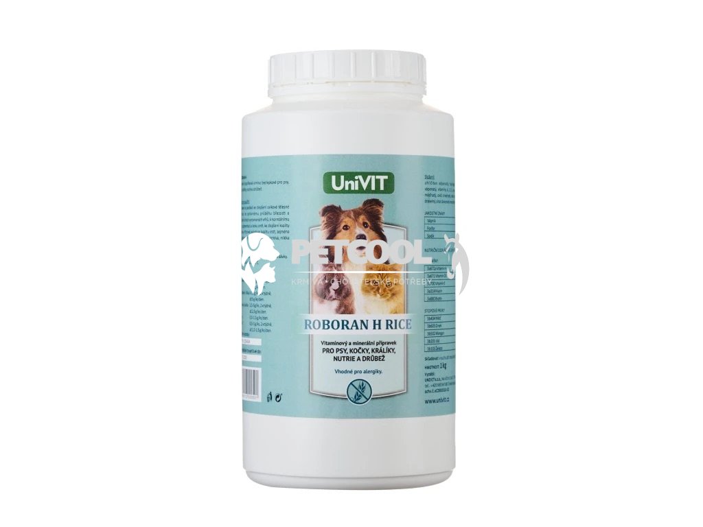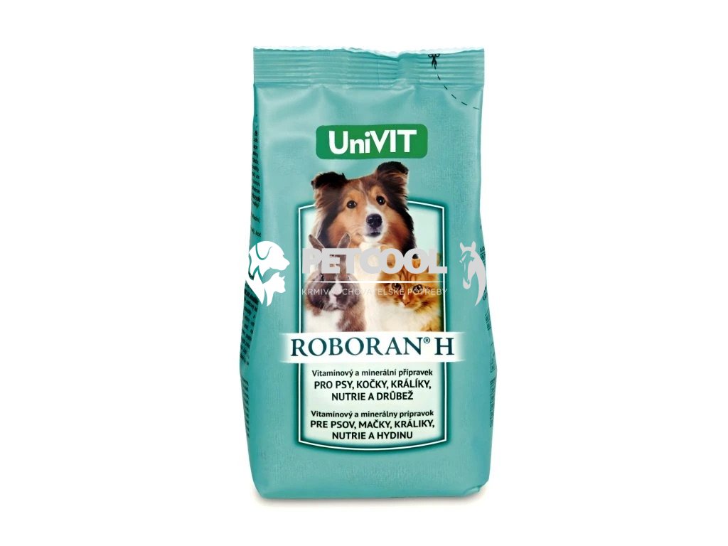 UniVIT ROBORAN® H je vitamínový a minerální doplněk pro psy, kočky, králíky a kožešinová zvířata. Obsahuje nejdůležitější vitamíny (včetně vitamínu H - biotin) a minerální látky v optimálním poměru. Prášek je ochucen tak, aby jej zvířata rádi přijímali. Výrazně ovlivňuje kvalitu srsti! Používá se preventivně ke zlepšení celkové tělesné kondice, ke správnému průběhu březosti a dosažení silných a vyrovnaných vrhů, k normálnímu růstu, pigmentaci a lesku srsti, ke zlepšení kvality kožešiny. Léčebně se používá při celkových onemocněních, hypovitaminózách, onemocněních kůže a v rekonvalescenci.