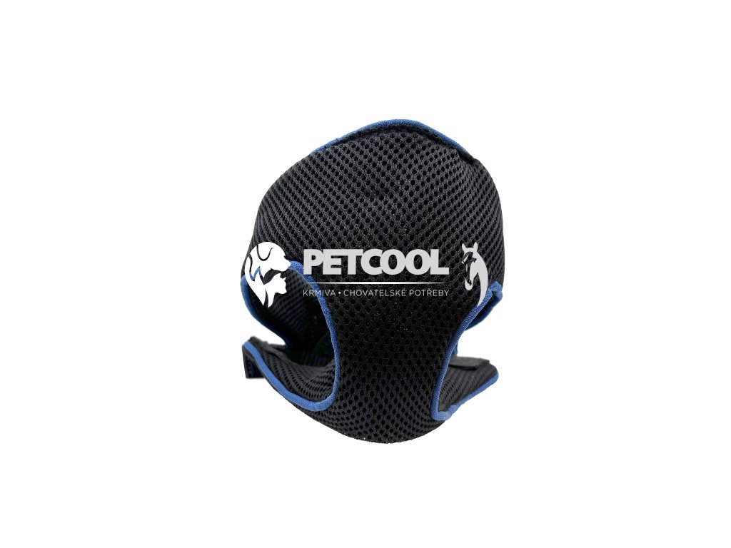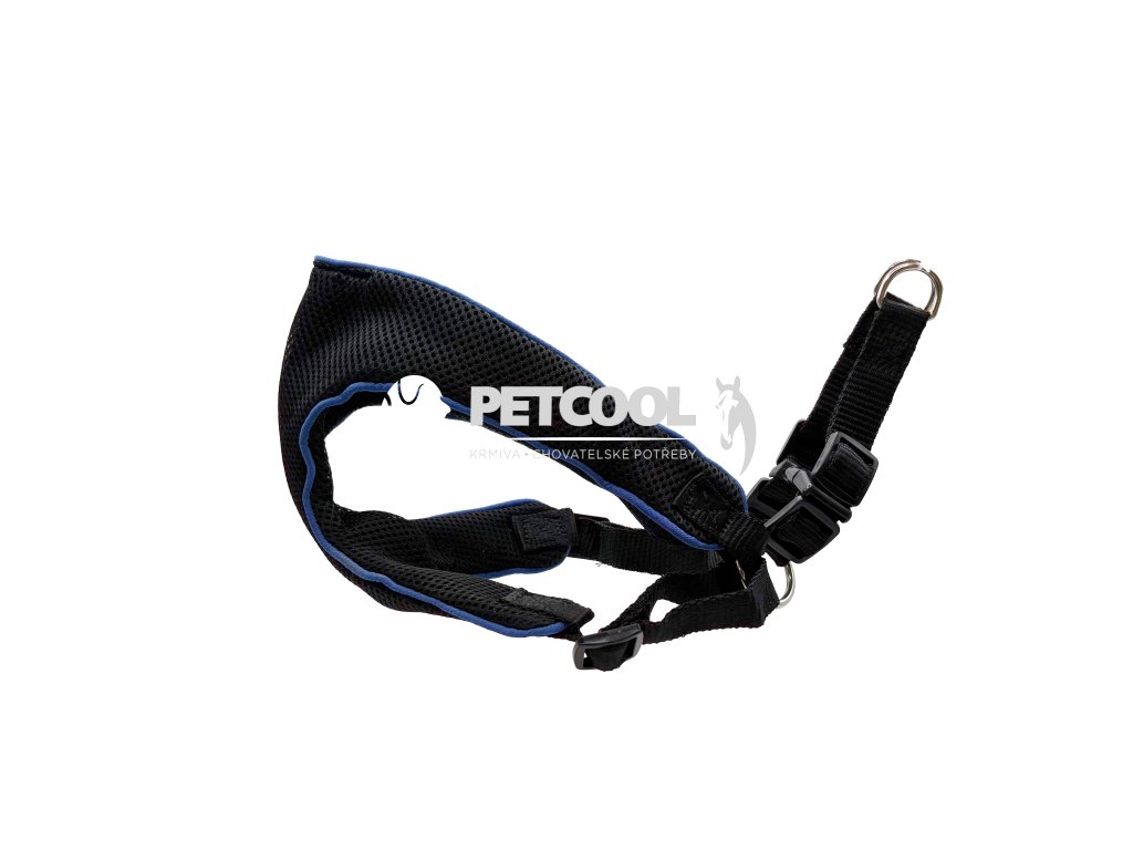 Pohodlný nylonový síťovaný postroj v černé barvě s modrým lemováním. Postroj je z dvojité vrstvy prodyšné síťoviny a zajišťuje optimální cirkulaci vzduchu. Díky tomu si i pes s hustší srstí může užívat pohodlí a komfortu po celou dobu procházky, aniž by se musel obávat přehřátí. Postroj lze nastavit ve čtyřech bodech, což umožňuje perfektní přizpůsobení postavě psa. Možnost nastavení zajišťuje pohodlí a bezpečnost a také minimalizuje riziko, že postroj bude psa stlačovat nebo omezovat v pohybu.