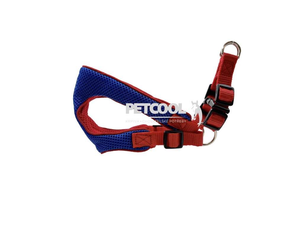 Pohodlný nylonový síťovaný postroj v kombinaci modré a červené barvy. Postroj je z dvojité vrstvy prodyšné síťoviny a zajišťuje optimální cirkulaci vzduchu. Díky tomu si i pes s hustší srstí může užívat pohodlí a komfortu po celou dobu procházky, aniž by se musel obávat přehřátí. Postroj lze nastavit ve čtyřech bodech, což umožňuje perfektní přizpůsobení postavě psa. Možnost nastavení zajišťuje pohodlí a bezpečnost a také minimalizuje riziko, že postroj bude psa stlačovat nebo omezovat v pohybu.