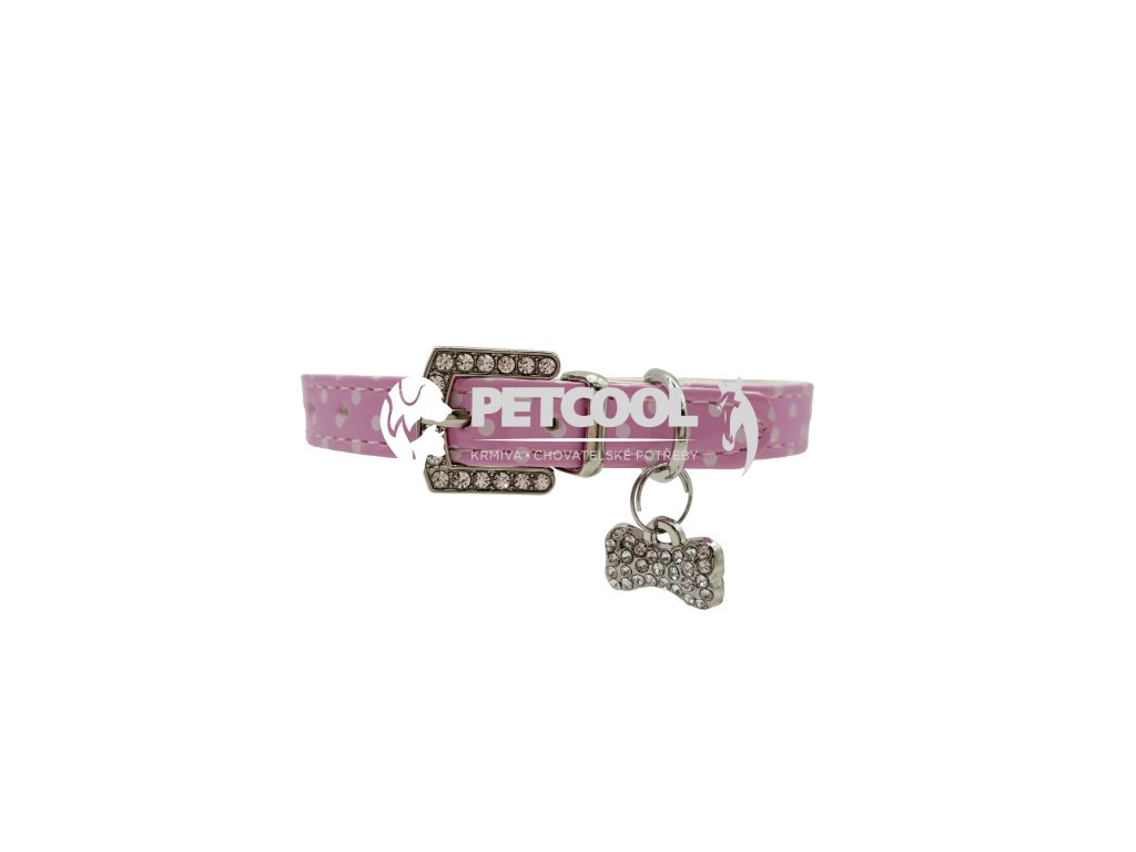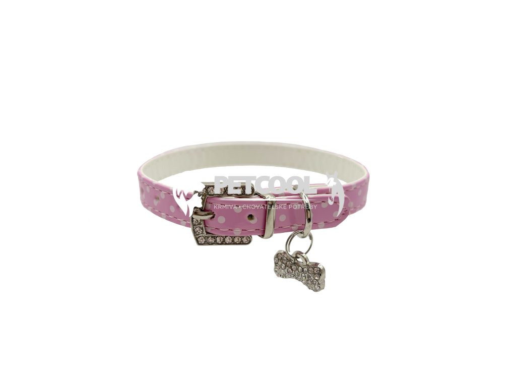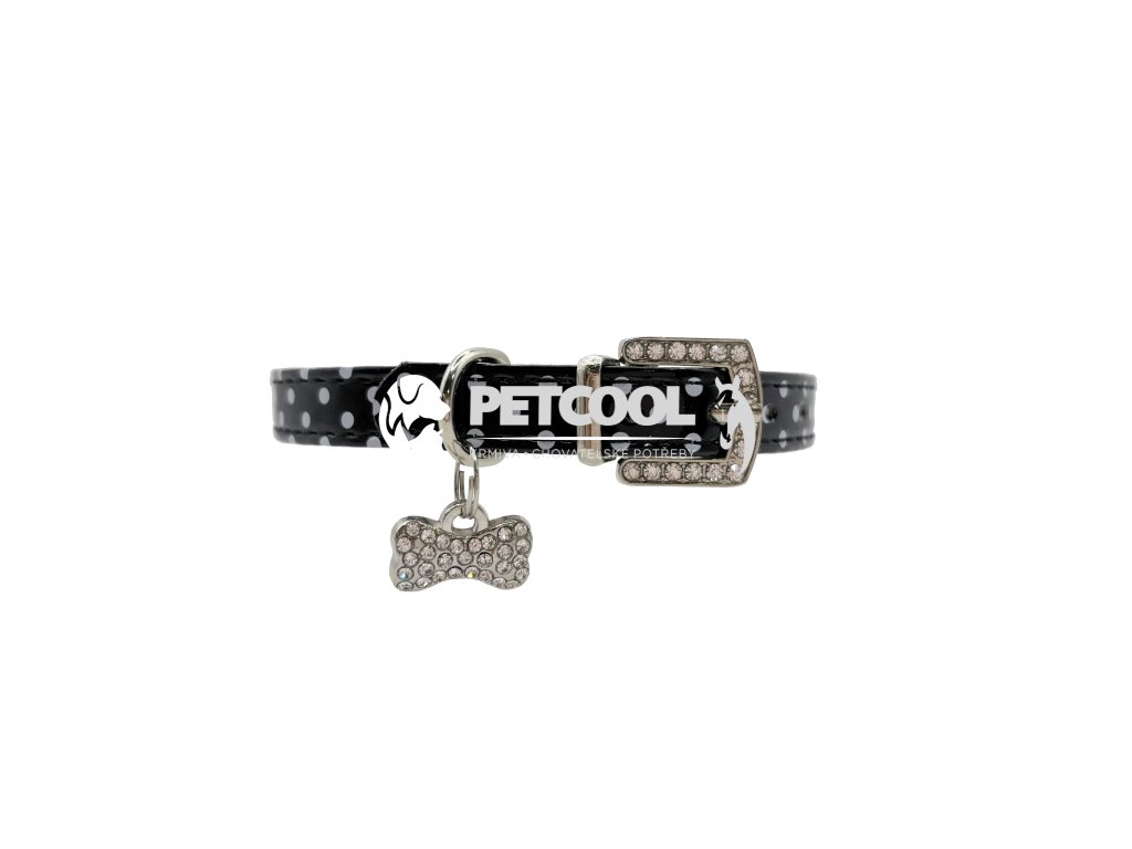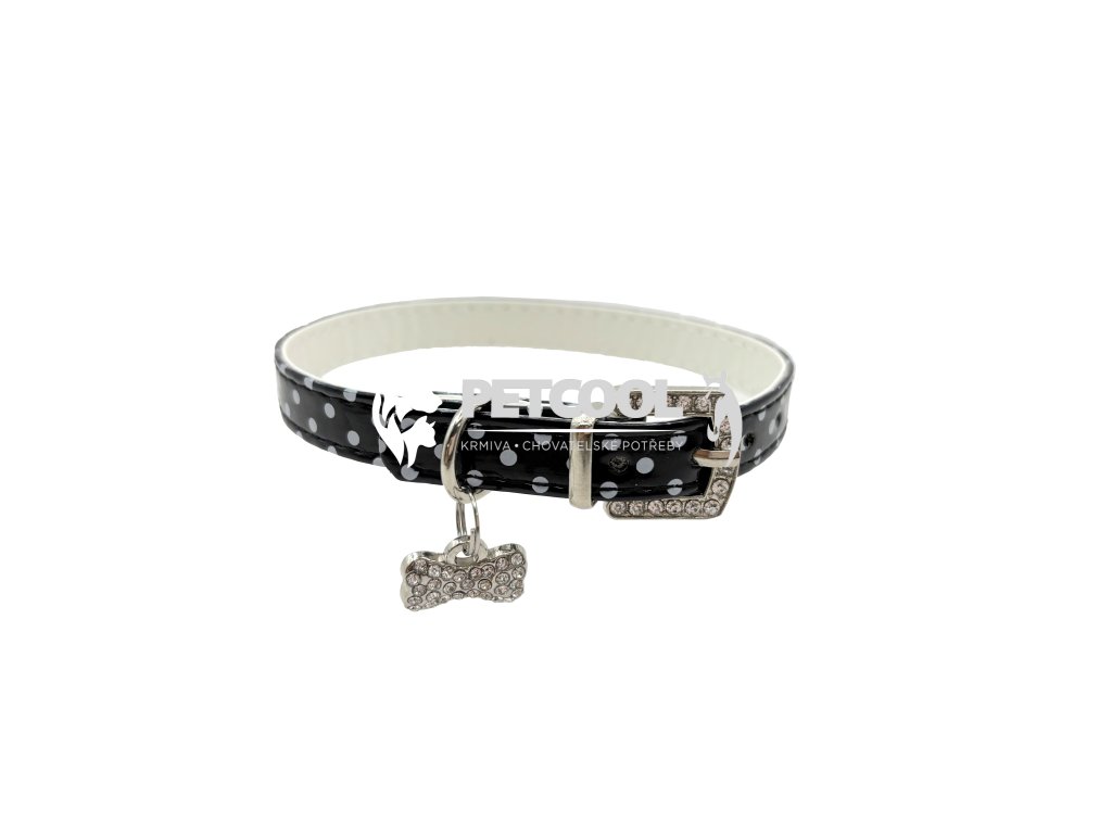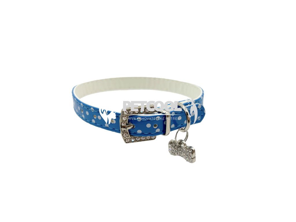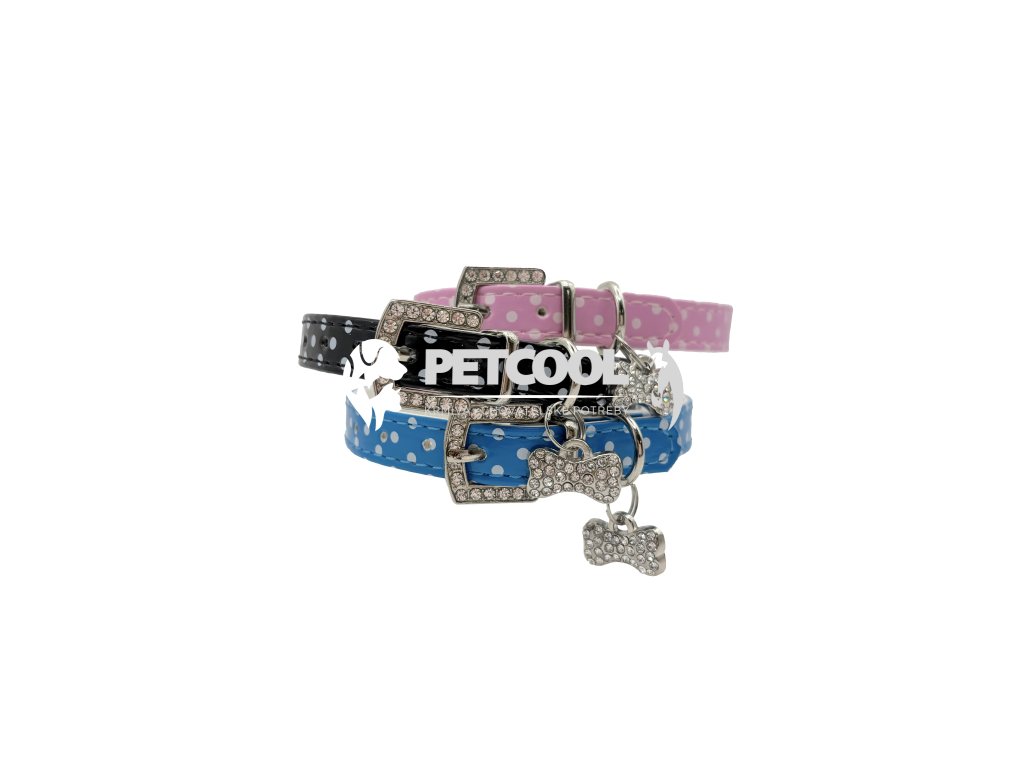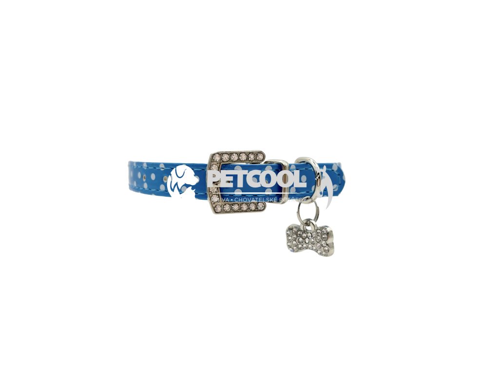 Luxusní obojek pro malé psy z příjemné eko kůže se vzorem puntíků, s přívěskem kostičky. Stříbrný přívěsek se třpytivými kamínky v bílé a modré barvě. Zapínací spona je taktéž osázena třpytivými kamínky. Zapínání je na klasickou přezku a dírky. Pro připnutí vodítka slouží svařované "D".