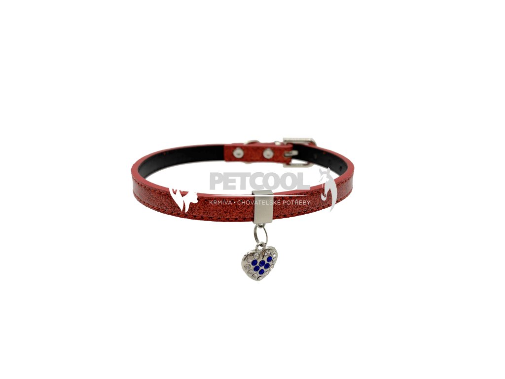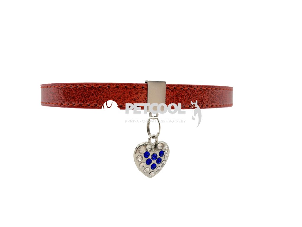Luxusní obojek pro malé psy z příjemné eko kůže v barvě červené, se snímatelným přívěskem srdce. Obojek je zdobený třpytem, který je přetřen pryskyřicí a tudíž se třpyt neoloupe. Stříbrný přívěsek se třpytivými kamínky v bílé a modré barvě. Tento přívěsek včetně posuvného kroužku lze zcela sejmout. Zapínání je na klasickou přezku a dírky. Pro připnutí vodítka slouží svařované "D".