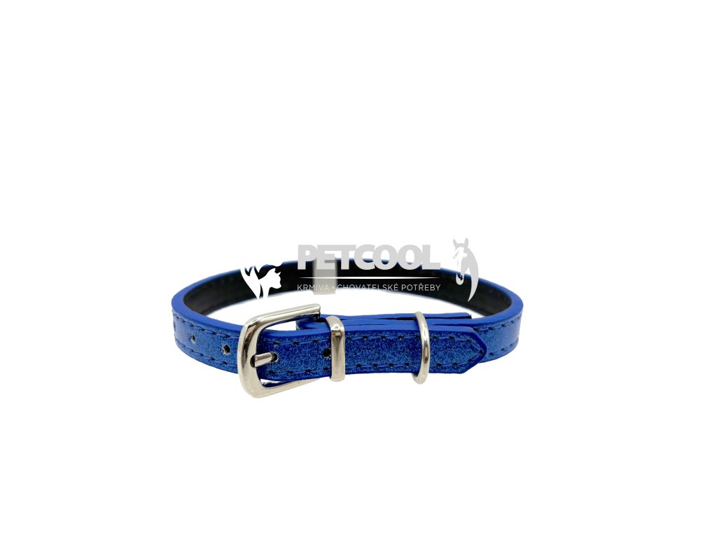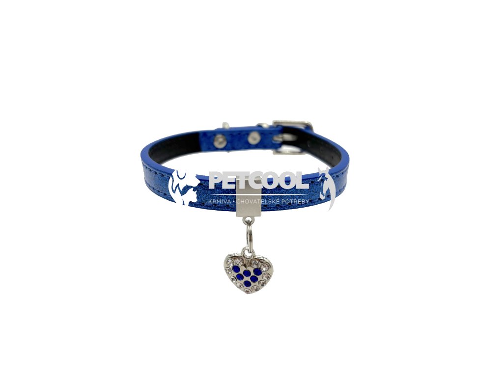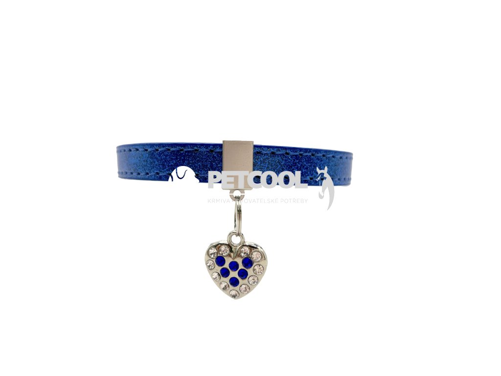 Luxusní obojek pro malé psy z příjemné eko kůže v modré růžové, se snímatelným přívěskem srdce. Obojek je zdobený třpytem, který je přetřen pryskyřicí a tudíž se třpyt neoloupe. Stříbrný přívěsek se třpytivými kamínky v bílé a modré barvě. Tento přívěsek včetně posuvného kroužku lze zcela sejmout. Zapínání je na klasickou přezku a dírky. Pro připnutí vodítka slouží svařované "D".