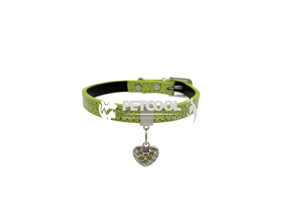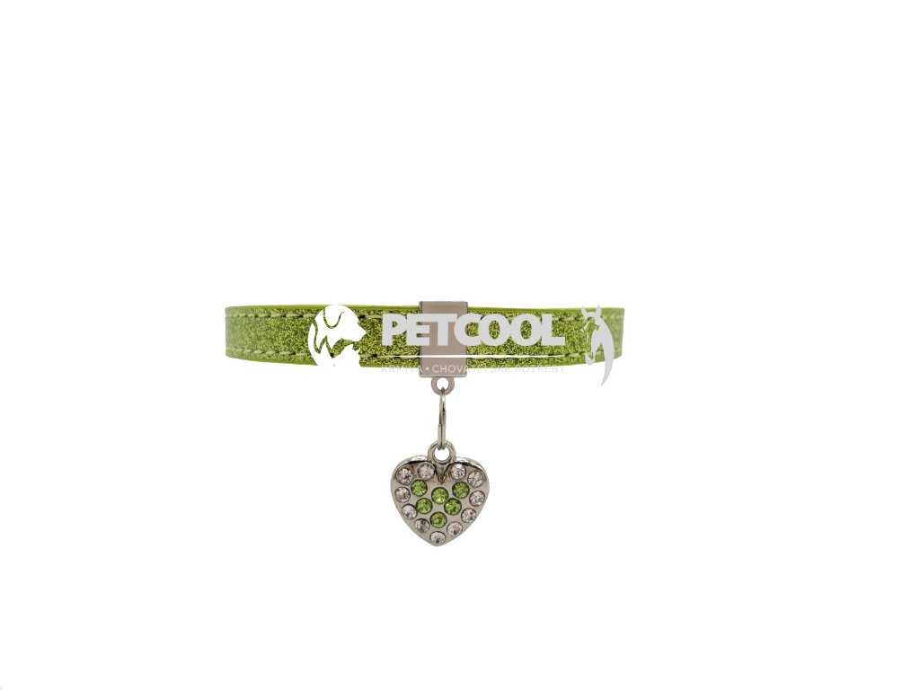 Luxusní obojek pro malé psy z příjemné eko kůže v limetkové růžové, se snímatelným přívěskem srdce. Obojek je zdobený třpytem, který je přetřen pryskyřicí a tudíž se třpyt neoloupe. Stříbrný přívěsek se třpytivými kamínky v bílé a zelené barvě. Tento přívěsek včetně posuvného kroužku lze zcela sejmout. Zapínání je na klasickou přezku a dírky. Pro připnutí vodítka slouží svařované "D".