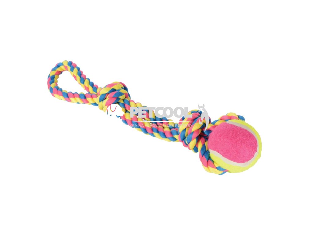 Bavlněné spletené lano, na kterém je navlečen tenisák. Hračka je určena k přetahování nebo aportování.