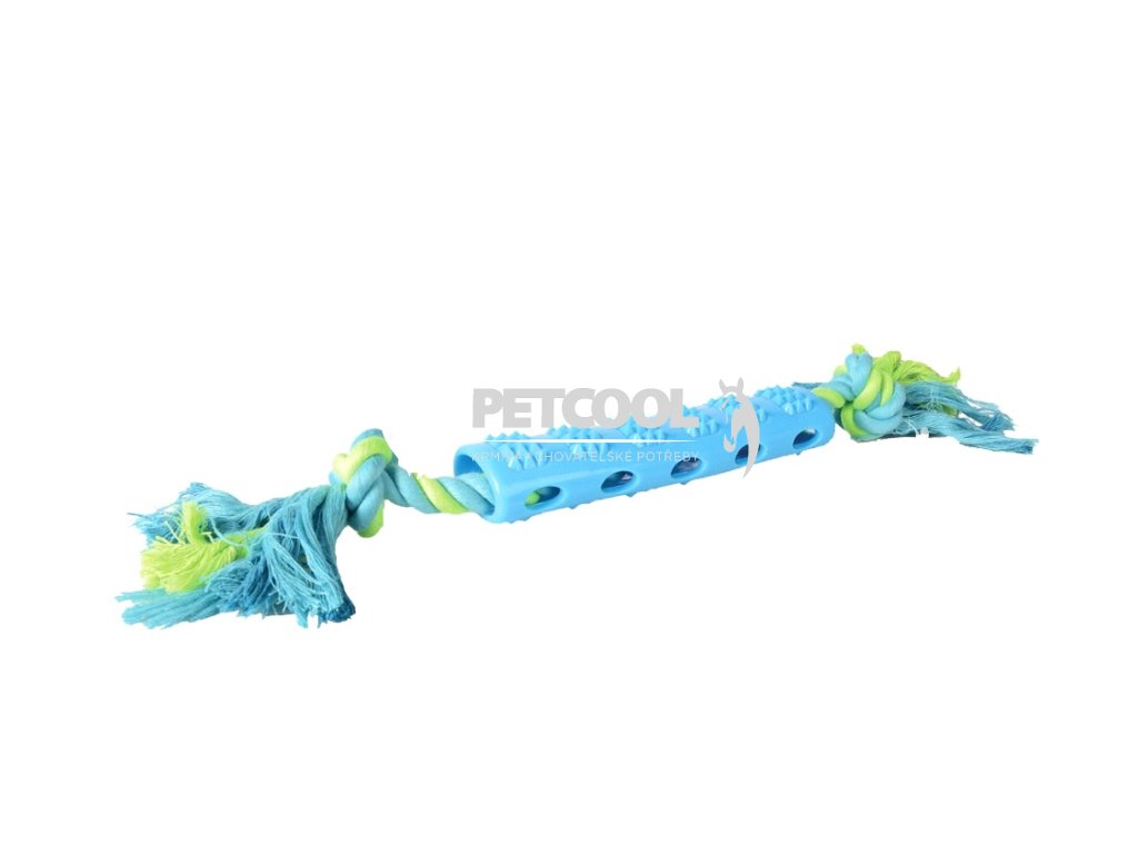 Bavlněné barevné lano s dvěma uzly, na kterém je navlečena trubička s dentálními prvky. Hračka je určena k přetahování, kousání a aportování. Odolná hračka kombinovaná s přírodním materiálem a TPR gumou.