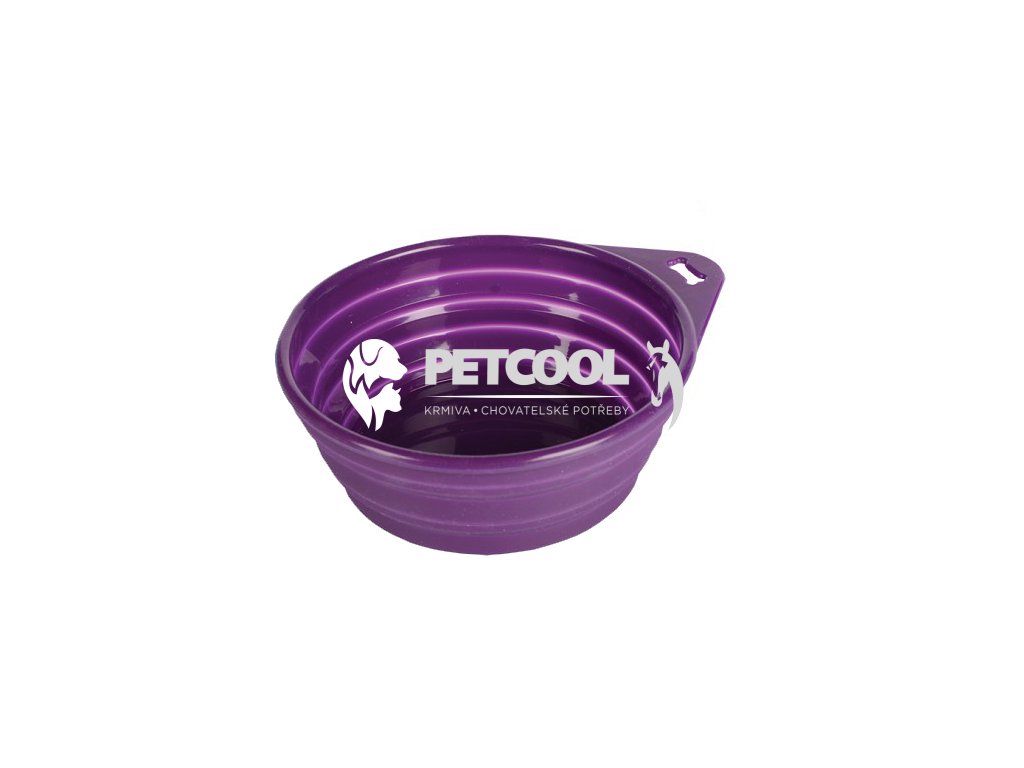 Skládací cestovní miska ve fialové barvě o objemu 1 litr. Praktické oko pro uchycení třeba za opasek nebo batoh.