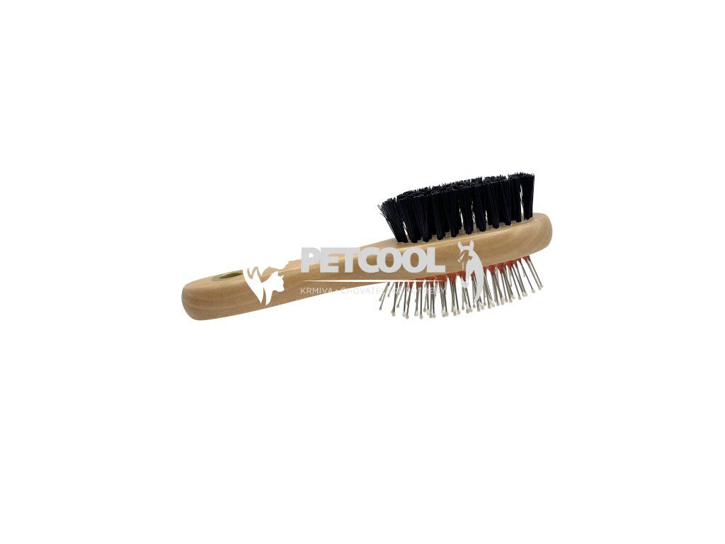 Oboustranný dřevěný kartáč. Česací drátky jsou zakončeny kuličkami pro snadné rozčesávání.
