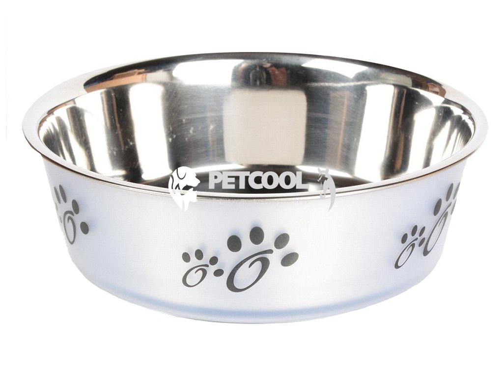 Nerezová miska s protiskluzovou úpravou dna. Miska je napevno vložena do plastového stříbrného obalu s motivem tlapek.