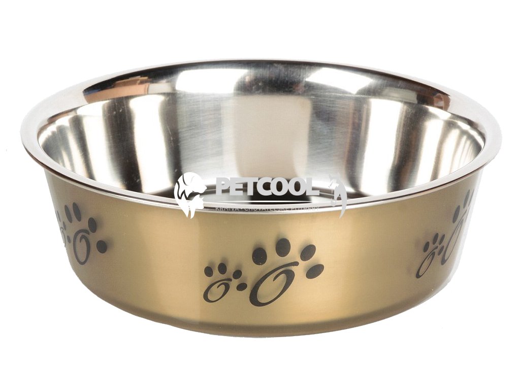 Nerezová miska s protiskluzovou úpravou dna. Miska je napevno vložena do plastového zlatého obalu s motivem tlapek.