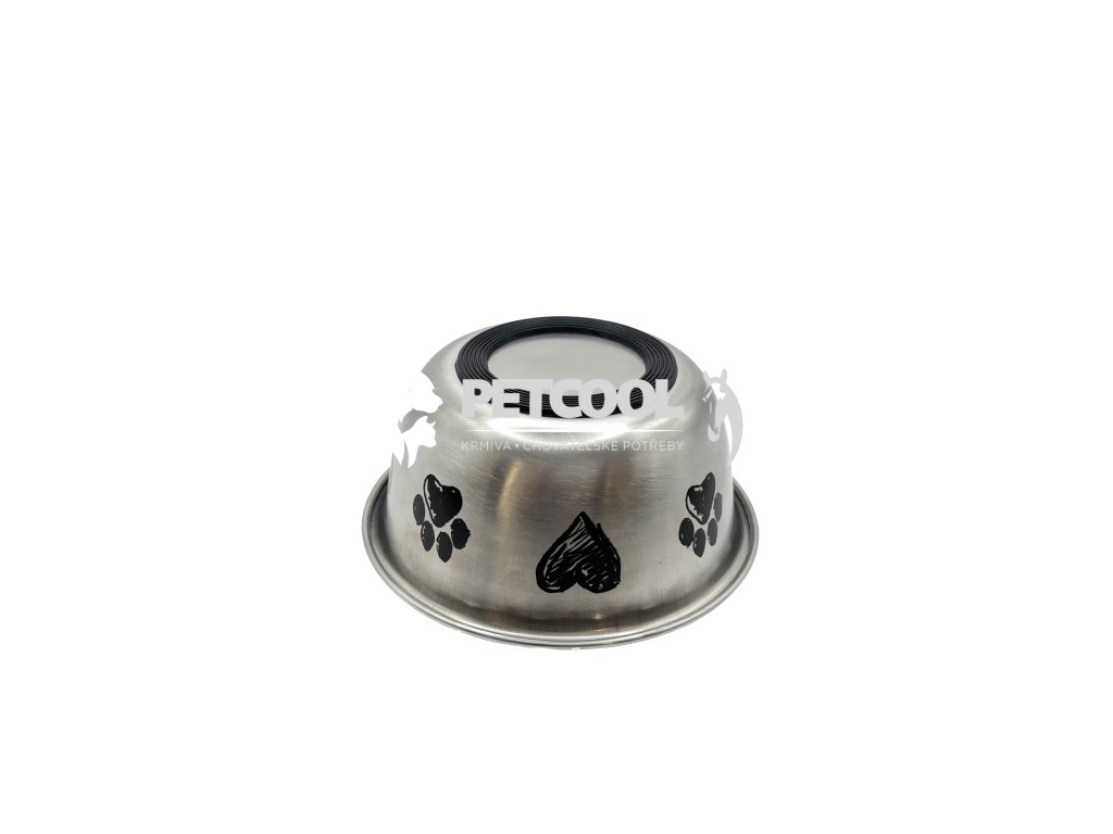 Nerezová miska TRIXIE s motivem tlapky a srdce. Materiál je pevnější nerez, není tak náchylný na převrhnutí misky.
