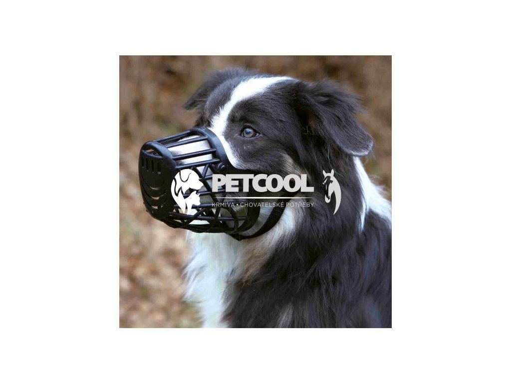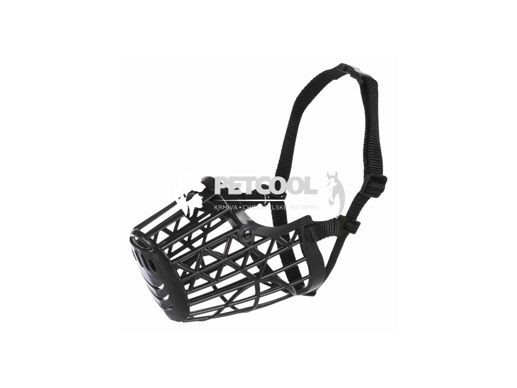 Plastový černý náhubek pro psy s dlouhým čumákem, s nylonovým nastavitelným řemínkem. Náhubek není tvrdý, je z měkčího poddajného plastu. U plastového náhubku je velmi praktická nízká váha, a hlavně to, když se pes ožene, je to bez následků modřin nebo vážného bolavého poranění.
