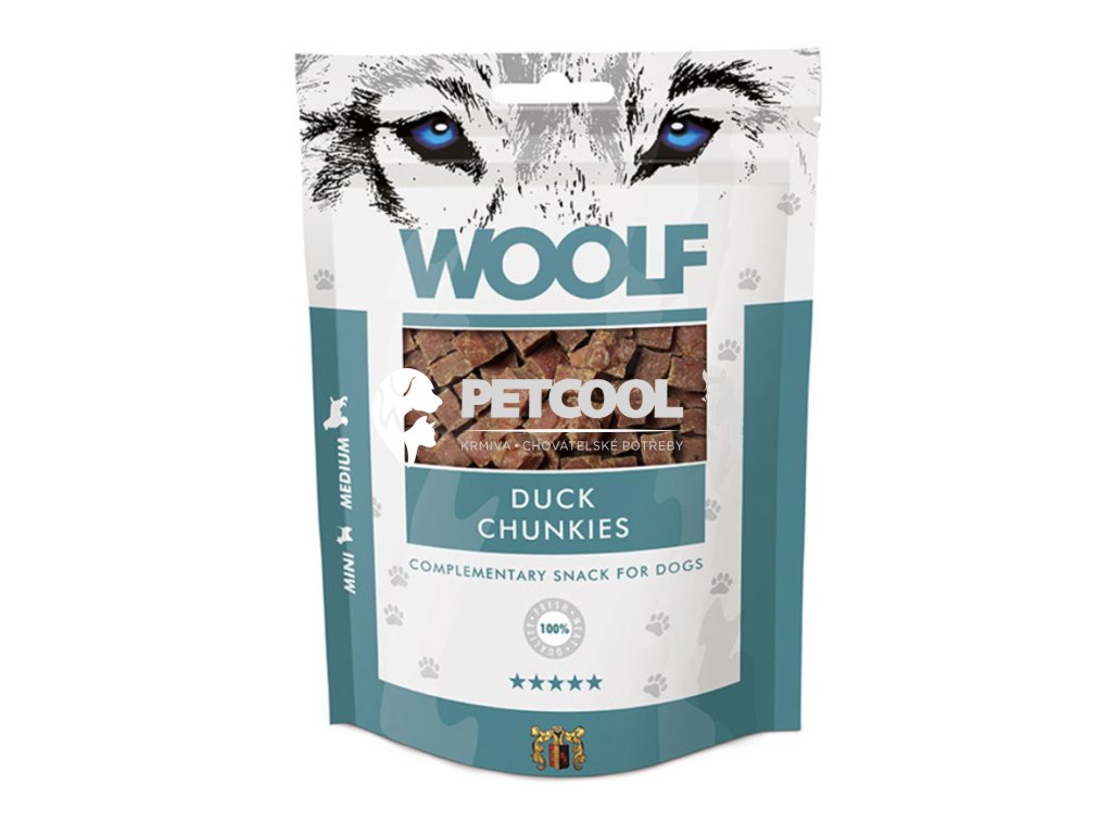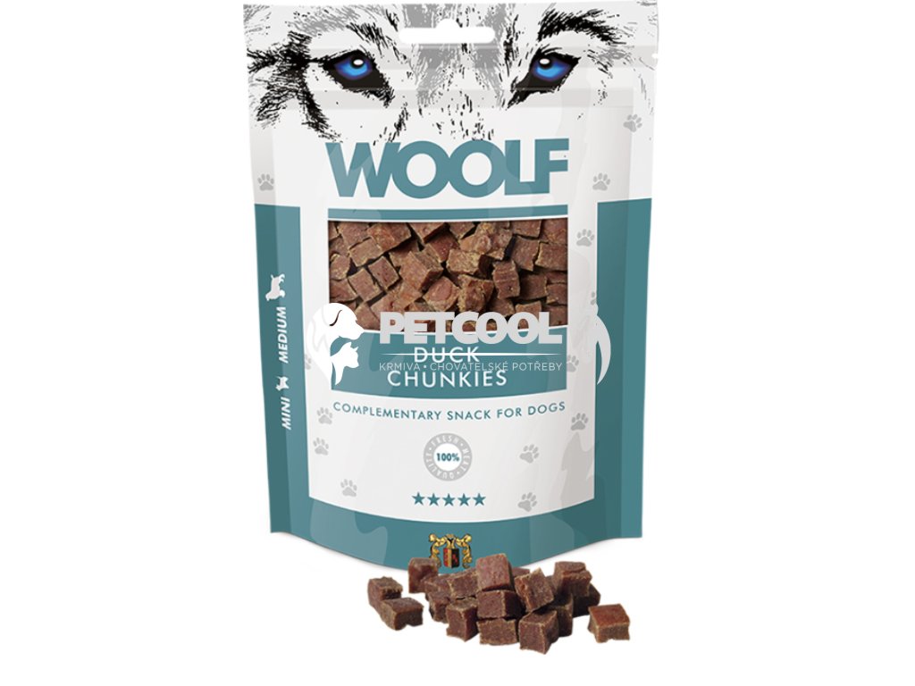 WOOLF DUCK CHUNKIES je masová poloměkká pochoutka ve tvaru malých kostiček. Vhodná zejména pro mini a malá plemena psů. Ideální i pro štěňata a starší psy.