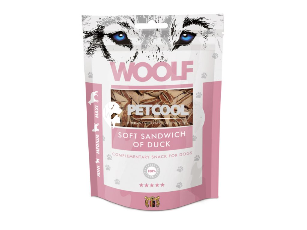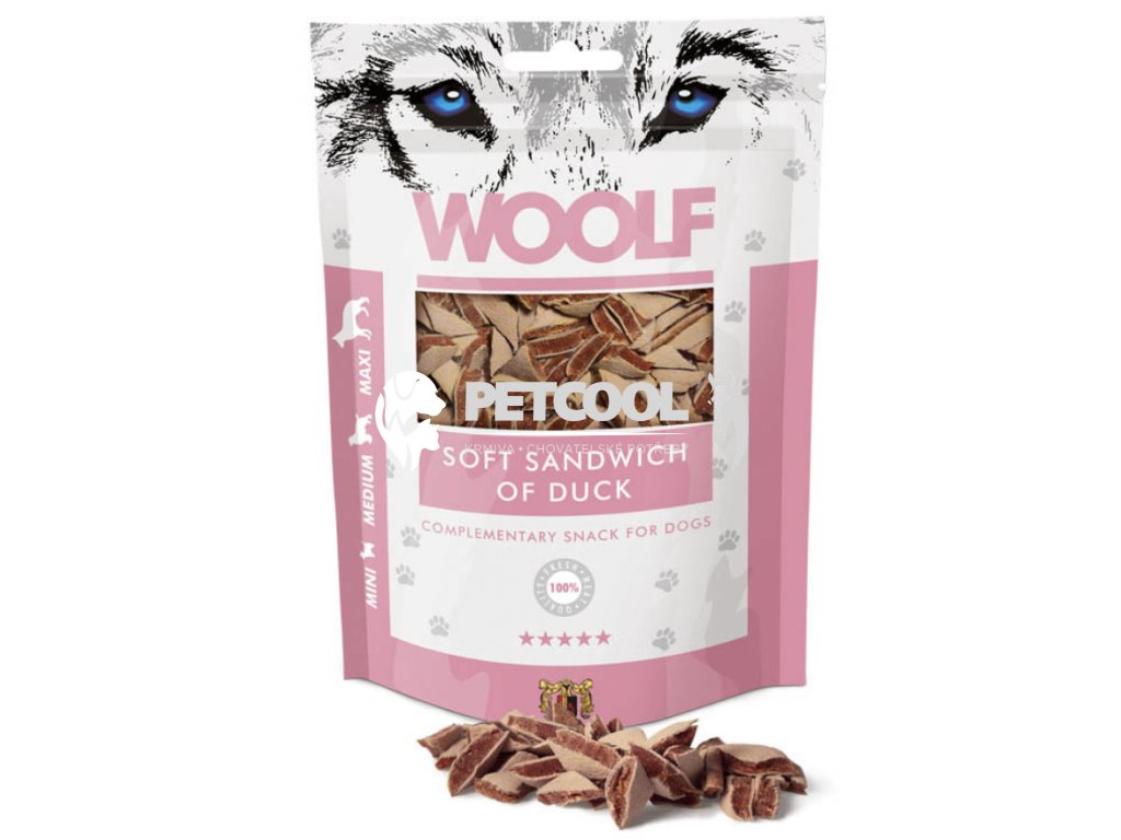 WOOLF SOFT SANDWICH OF DUCK je masová pochoutka ve tvaru malého trojúhelníku v podobě sendviče. Velmi měkký pamlsek vhodný zejména pro malá a střední plemena psů. Ideální pro štěňata a starší psy.