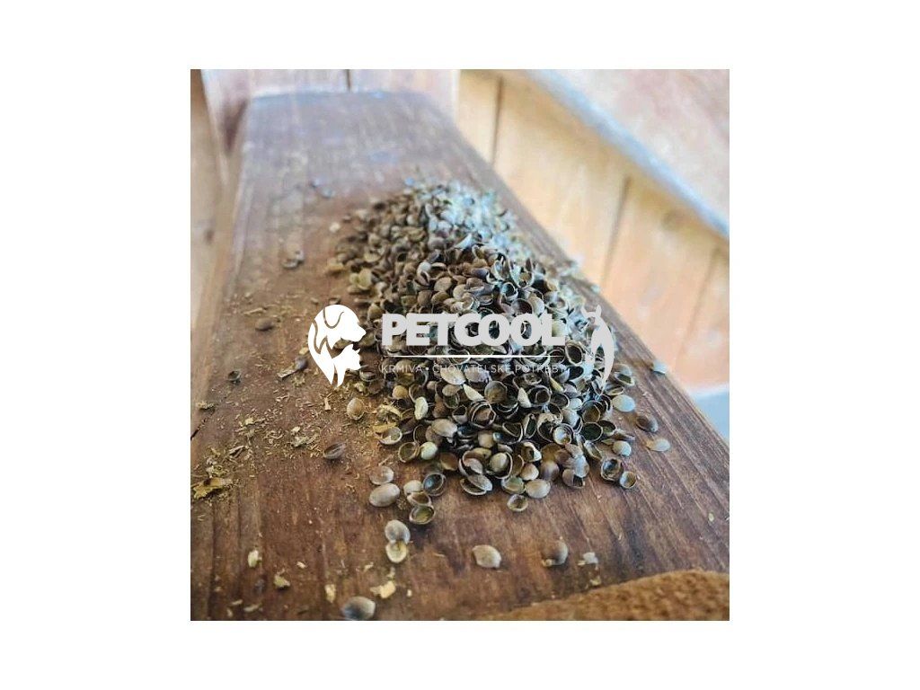 Složení: slupky se zbytky jádra konopného semínka.