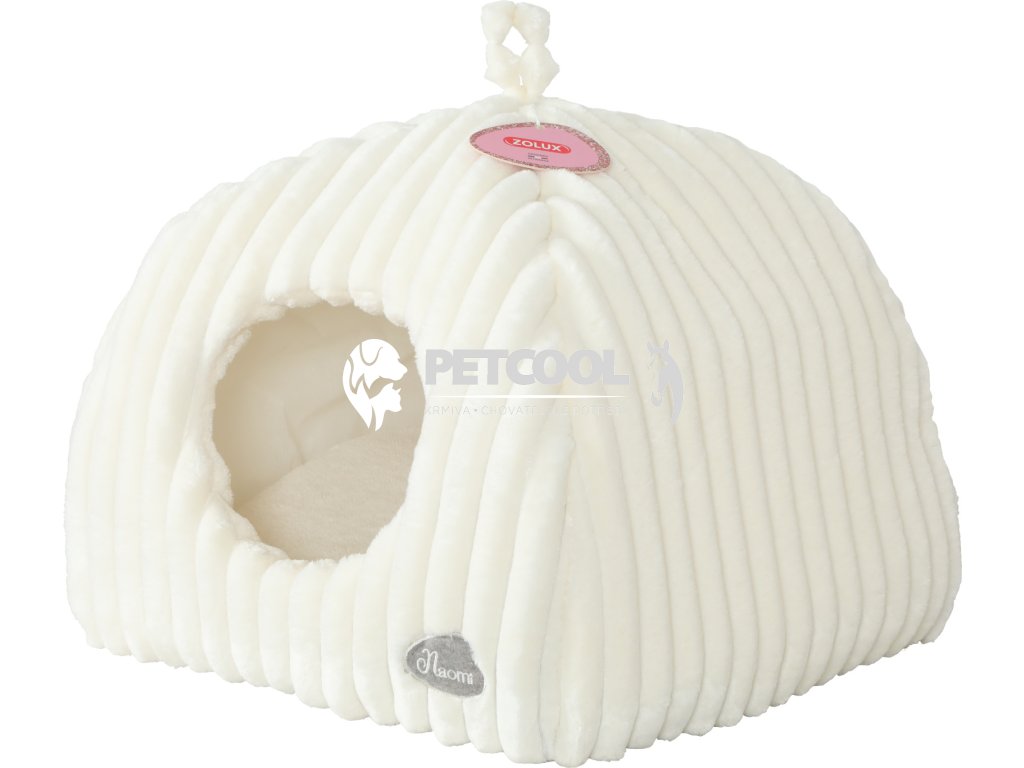 Komfortní tulivý pelíšek pro kočky ve tvaru iglú. Pelíšek má kulatý otvor, umělou kožešinu v krémové barvě. U otvoru je šedá plstěná nášivka s nápisem "Naomi" a dno pelíšku je bavlněné.