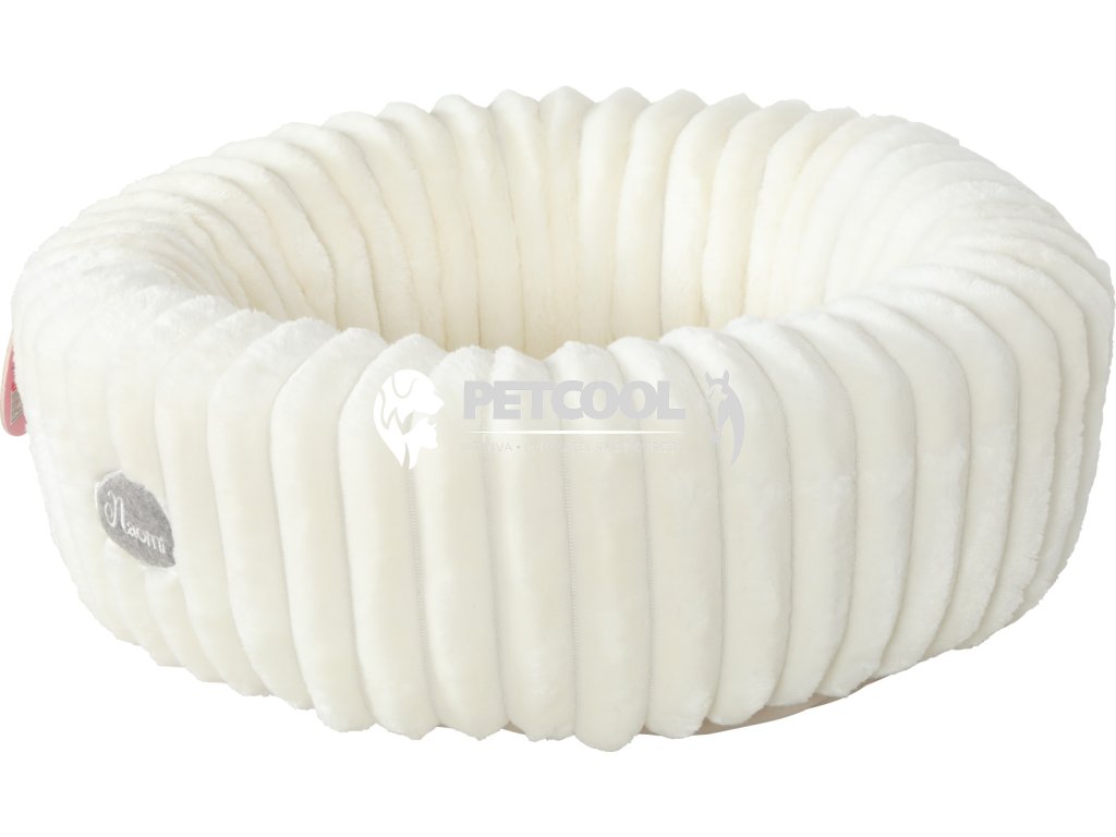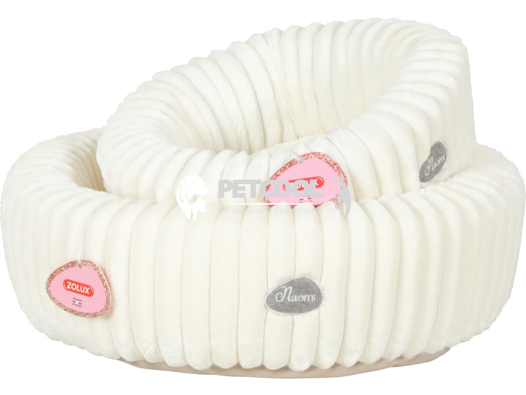 Komfortní tulivý kulatý pelíšek pro kočky a malé psy. Pelíšek je z umělé kožešiny v krémové barvě. Na obvodu je šedá plstěná nášivka s nápisem "Naomi" a dno pelíšku je bavlněné.