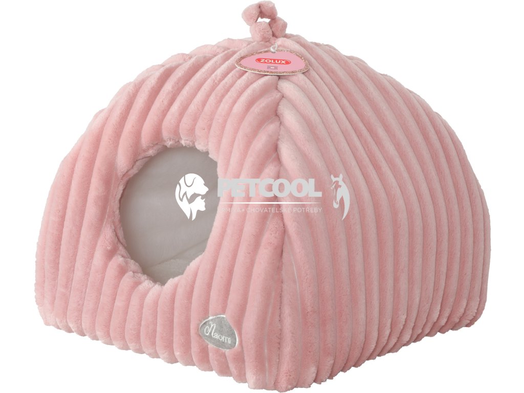 Komfortní tulivý pelíšek pro kočky ve tvaru iglú. Pelíšek má kulatý otvor, umělou kožešinu v krémové barvě uvnitř a růžové po obvodu. U otvoru je šedá plstěná nášivka s nápisem "Naomi" a dno pelíšku je bavlněné.