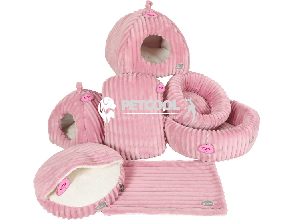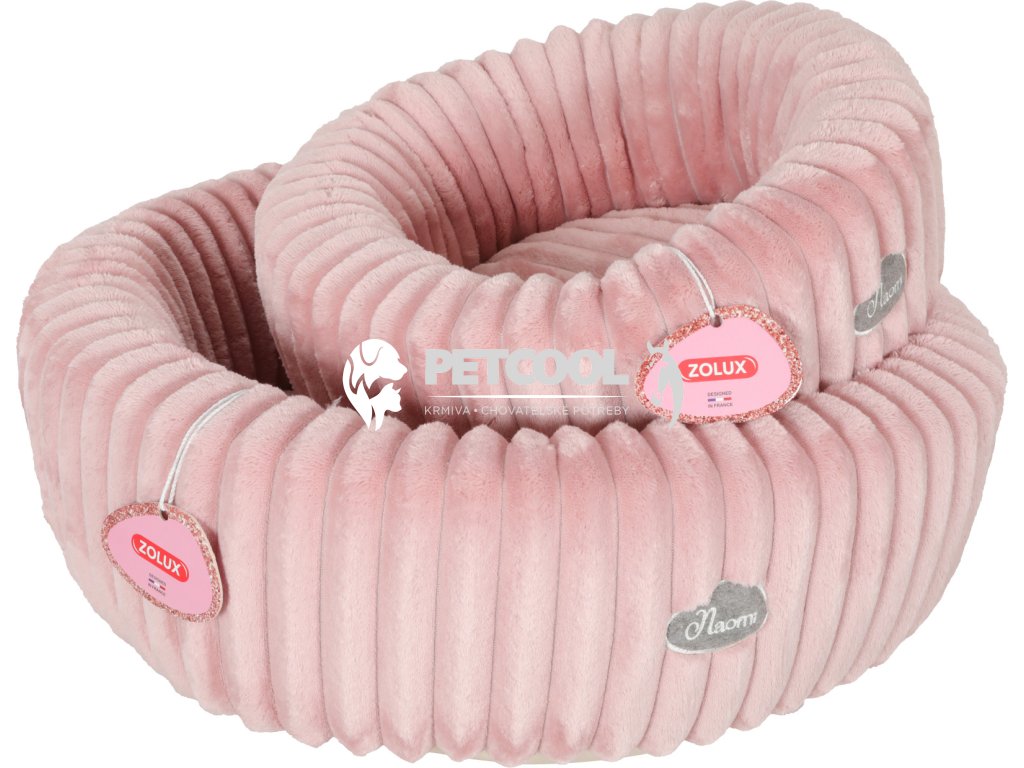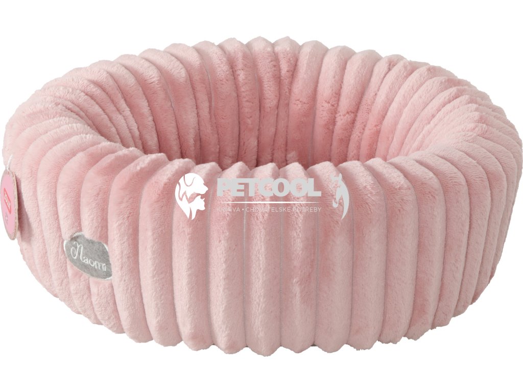 Komfortní tulivý kulatý pelíšek pro kočky a malé psy. Pelíšek je z umělé kožešiny v růžové barvě. Na obvodu je šedá plstěná nášivka s nápisem "Naomi" a dno pelíšku je bavlněné.