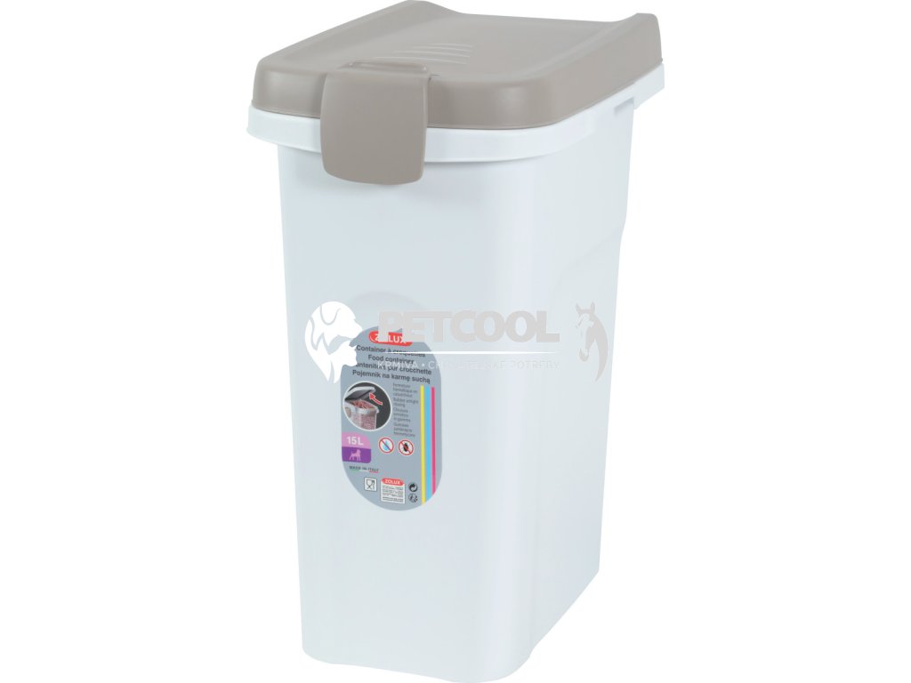 Plastový kontejner na suché krmivo. Kontejner se vzduchotěsným uzávěrem. Tímto způsobem uskladňování zůstává krmivo vždy čerstvé a voňavé. Zabraňuje cirkulaci vzduchu, který způsobuje nevábnost krmiva. Díky boxu uložíte hygienicky otevřený pytel granulí či jiného suchého krmiva. Vždy doberte kontejner do prázdna, a nový pytel sypte do čistého kontejneru bez zbytků.