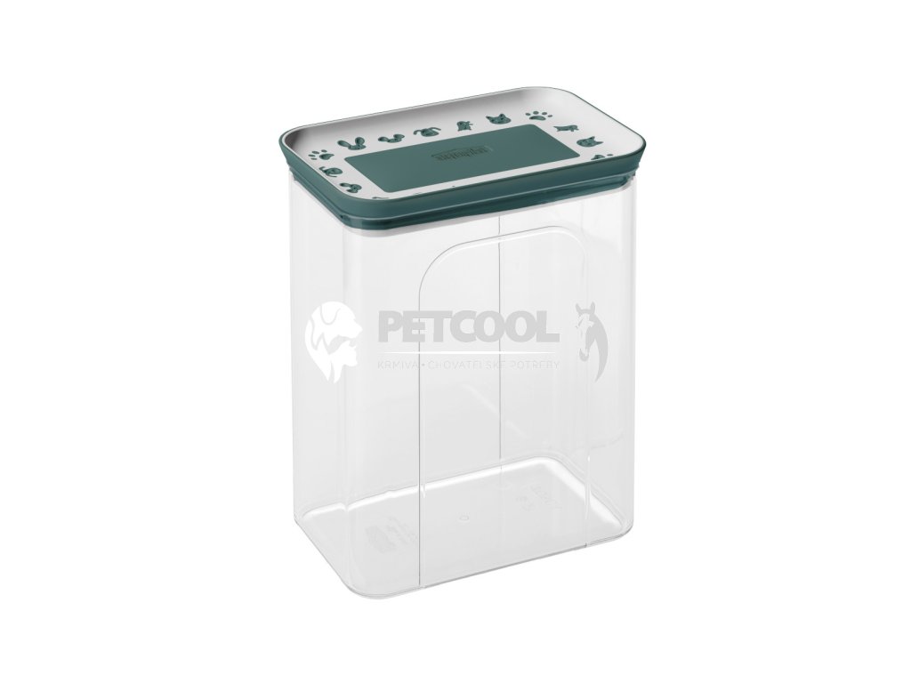 Plastový transparentní box na suché krmivo nebo pamlsky. Transparentní provedení se zeleno bílým víkem, které má na sobě 3D siluety mazlíčků (pes, kočka, králík, pták). Box má pod víkem těsnění, které zabraňuje úniku pachu. Tímto způsobem uskladňování zůstává krmivo vždy čerstvé a voňavé. Zabraňuje cirkulaci vzduchu, který způsobuje nevábnost krmiva. Díky boxu uložíte hygienicky otevřený pytel malých granulí nebo pamlsků. Vždy doberte box do prázdna, a nový pytel sypte do čistého boxu bez zbytků.
